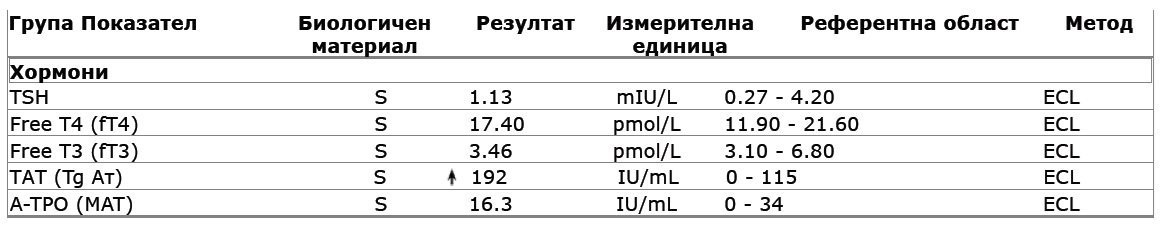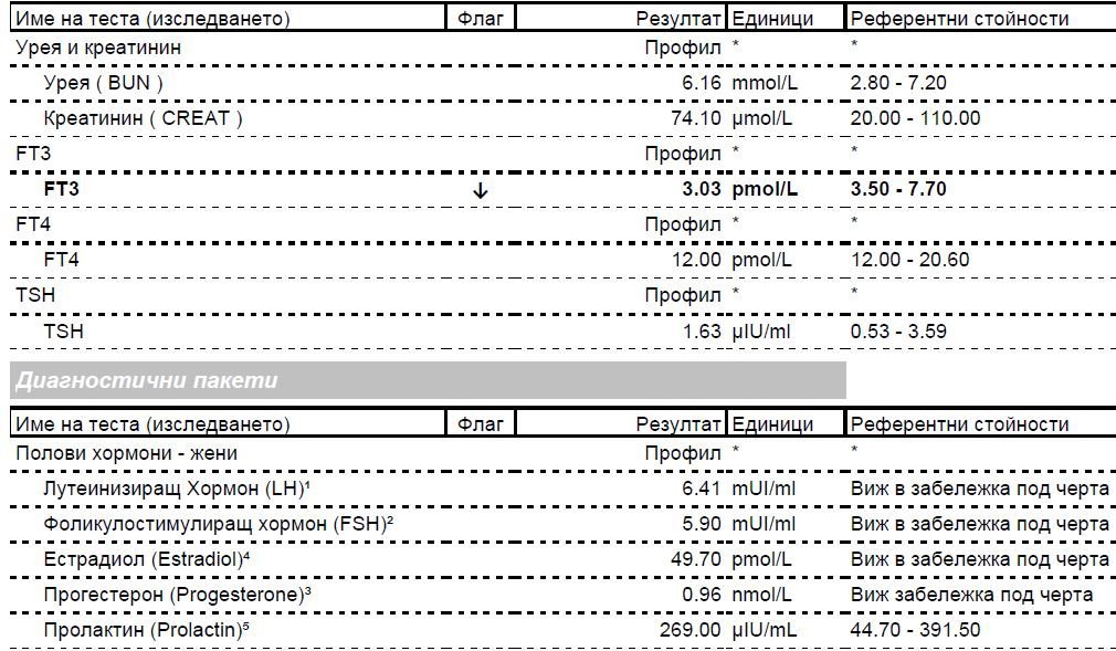 Случайно попаднах на вас и моля някой да погледне резултатите на дъщеря ми,защото честно казано се притесних докато ви четях (успях да изчета само последната тема). Накратко, дъщеря ми е с липсващ цикъл - последно й дойде в края на октомври. След последния преглед гинеколожката я прати за изследване на хормони, а аз реших да пусна и щитовидна жлеза. Но не съм знаела, че трябва да включа ТАТ и МАТ. Според гинеколожката ми всичко било наред и да чакаме. Липсата на цикъл го отдава на стреса на организма от смяна на хранителния режим на дъщеря ми. От година не консумира глутен и въобще не яде тестени неща (дори и такива с безглутенови брашна),също сладки неща от магазина - торти,вафли и подобни боклуци.Доста отслабна, но твърди, че се чувства добре и отказва да се връща към стария начин на хранене. Преди имаше чести болки в червата, подуване,газове,дискомфорт. Извинявам се за дългия пост, но според мен тези неща са важни и искам да ги споделя. Относно резултатите, на мен ми се сториха леко притеснителни и затова реших да потърся информация в нета. Така попаднах на вас и ще бъда благодарна за съвет. Благодаря предварително за отделеното време да ме изчетете Hug