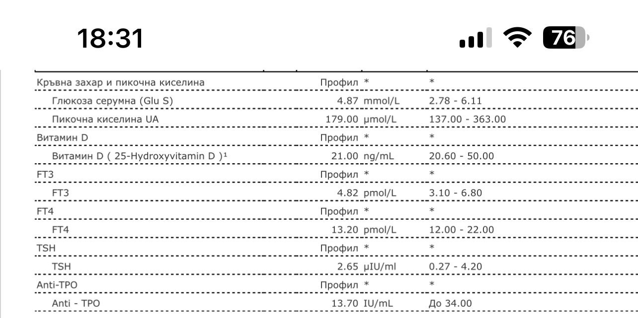 Rusi_be, щитовидните не са добре, в хипофункция си. Но едва ли ще намериш лекар, който ще се съгласи да ти изпише хормон, ако това е целта ти.