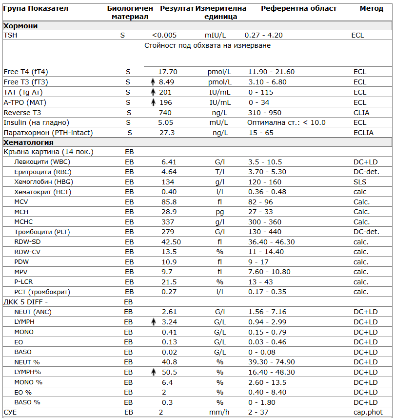 Здравейте, от известно време следя темата и сега реших да пиша по повод последните ми резултати. Посетих Ендокринолог наскоро със следните оплаквания - покачване на теглото - качила съм около 6 кг за два месеца, като междувременно се храня здравословно и балансирано, не преяждам, дори по-скоро съм в дефицит. Тренирам 5 пъти в седмицата, вкъщи, но относително интензивни тренировки. Уморена съм, имам косопад, много суха кожа по ръцете, особено около ноктите, петите също. Бях при доктор Шигарминова, в стари теми видях, че се препоръчва. Тя ми пусна щитовиден панел, но каза, ако стойностите са в граници, да търся проблем другаде. Можете ли да ми дадете насока - какво мога да правя с тези стойности сега? Има ли лекар, който ще ми обърне внимание? Мога ли да си самоназнача нещо?