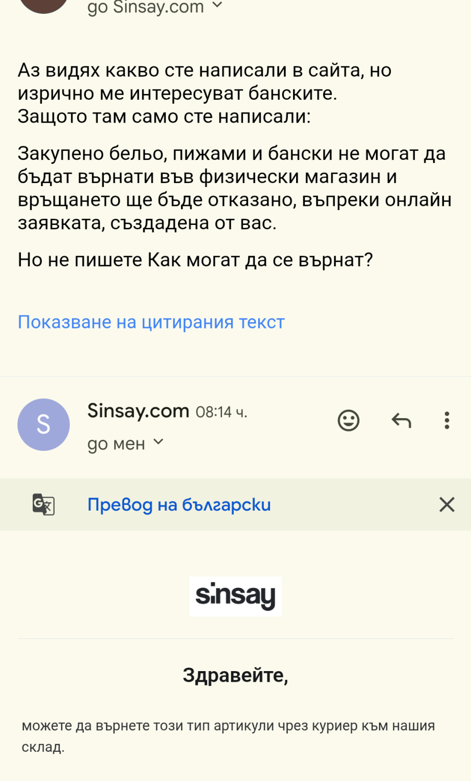 Аз от Синсей бански и бельо затова не купувам, като знам колко са се връщали до сега.