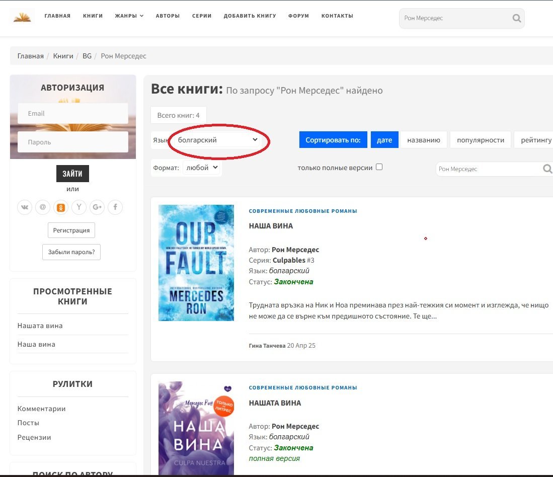 Здравейте! Извинявам се за глупавия въпрос, но досега не съм работила със сайта рулит. Търсех книгата на Мерседес Рон Наша вина, но я свалих и видях, че е на руски, а в описанието пише български. Аз ли не правя нещо като хората или наистина е само на руски?