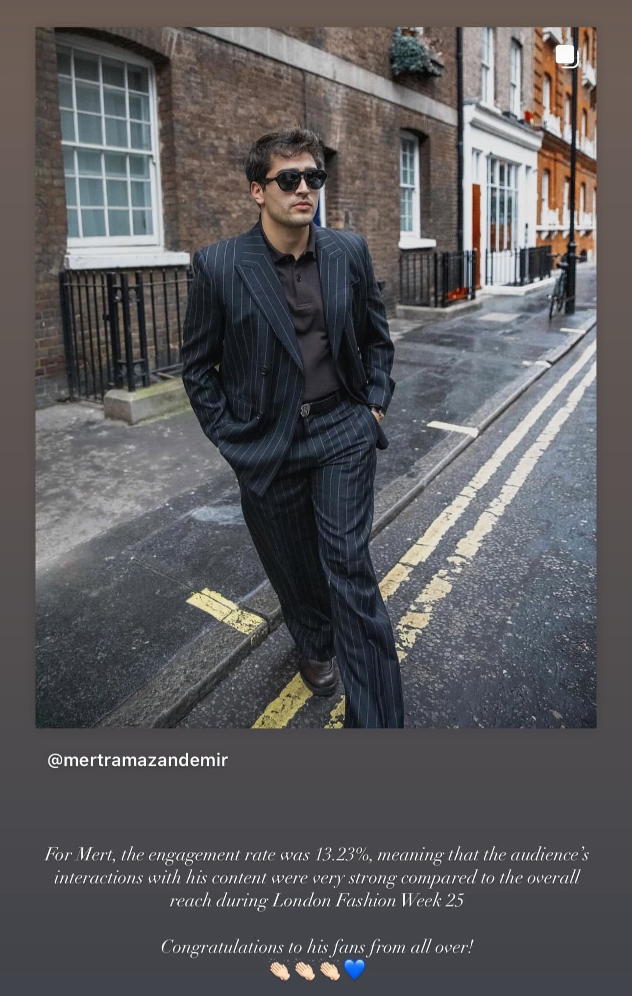 „Участвайки в Седмицата на модата в Лондон като първият турски актьор, Мерт Рамазан Демир се класира на първо място в списъка с най-обсъжданите гости с най-висок процент на увеличение и четвърти в общия списък с гости.“
