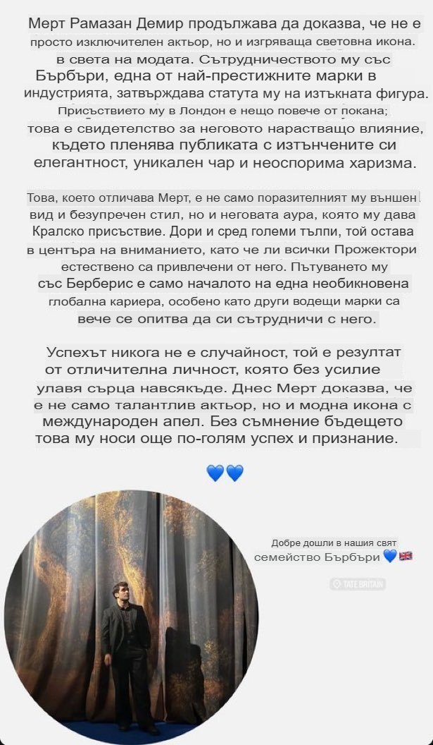 Възхищавам се и се гордея с Мерт, който никога не спира да работи, е пример за трудолюбие, мълчалива работа, спокойствие и артистична зрялост. От Париж до Лондон, звезда, която надмина всички със светлинни години. Името му е Мерт Рамазан Демир. Колко любов и гордост!