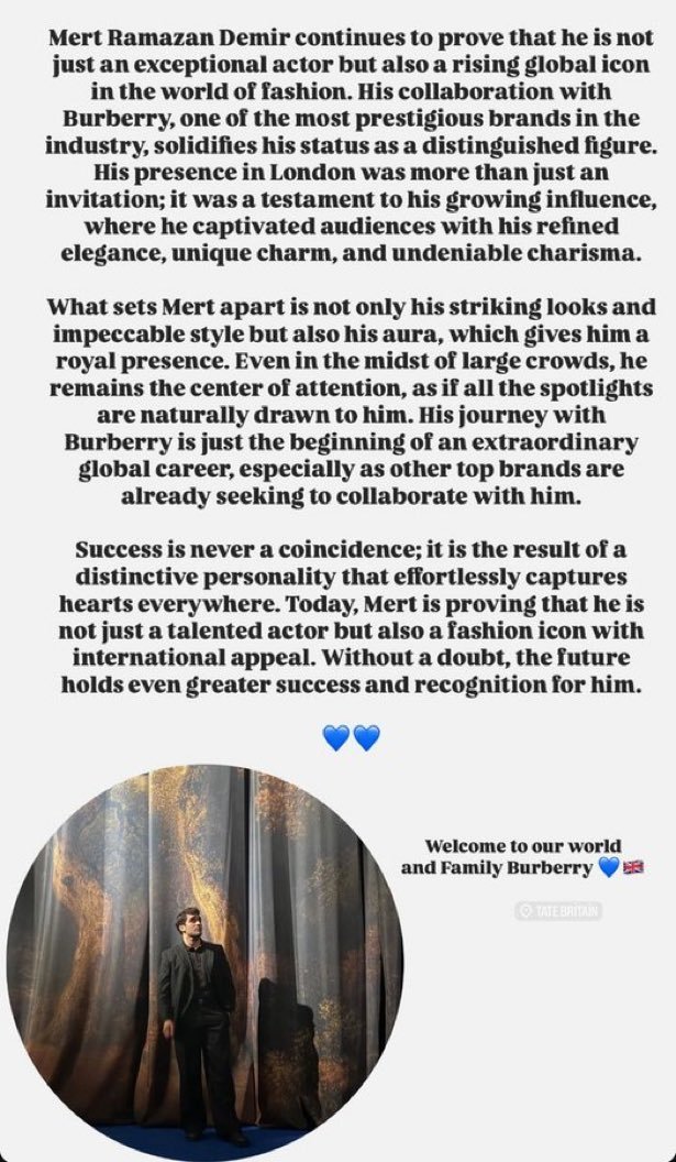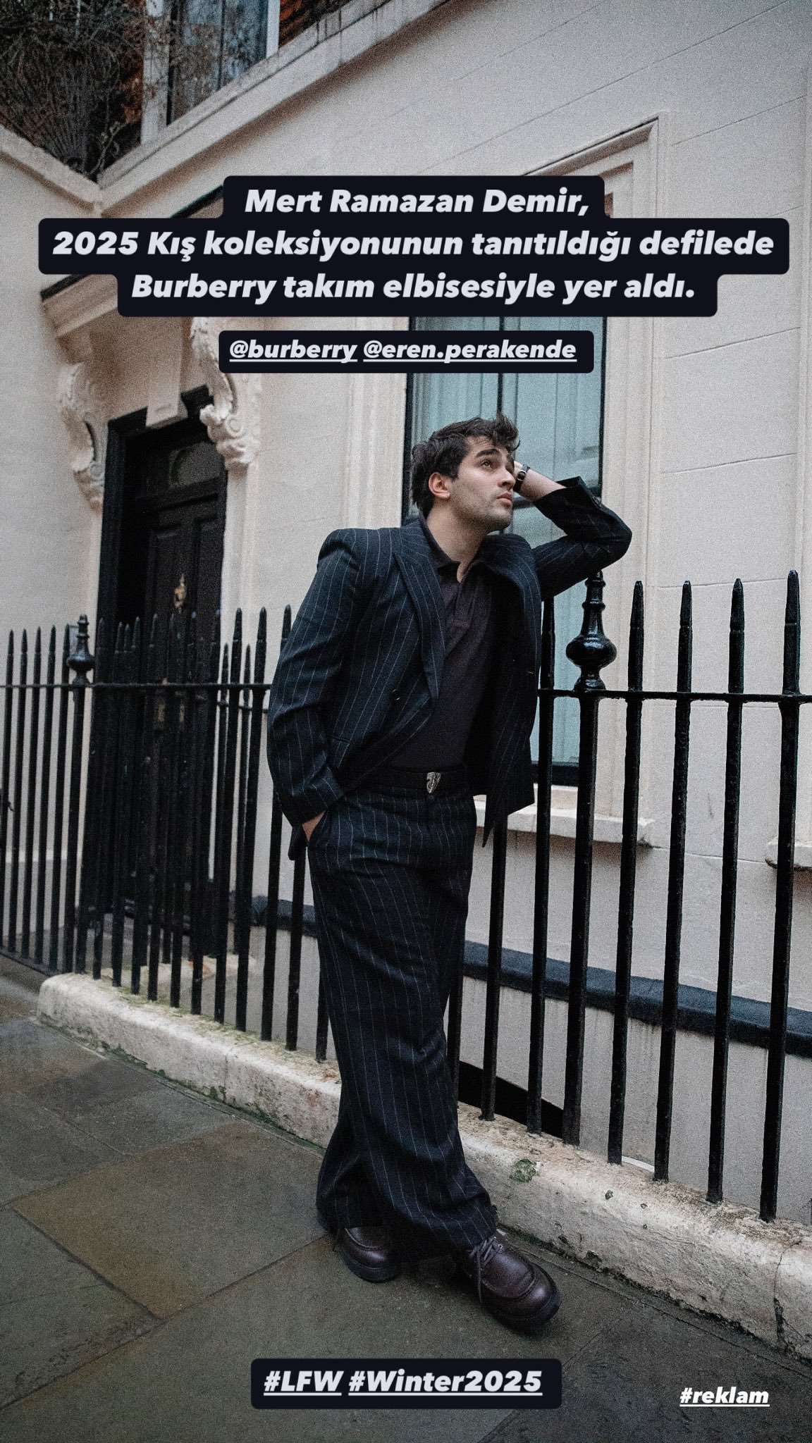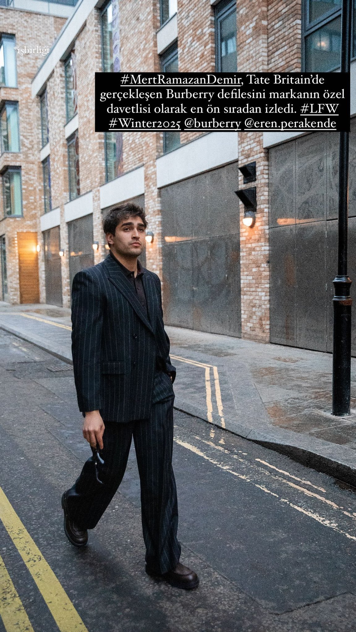От публикация в Instagram на Vogue Turkey #MertRamazanDemir ⭐️ "Колекцията Зима 2025 беше представена на #Burberry модно ревю, проведено в Тейт Великобритания като част от Седмицата на модата в Лондон. Мерт Рамазан Демир от Турция взе участие в модното ревю, където световноизвестни имена заеха своето място."