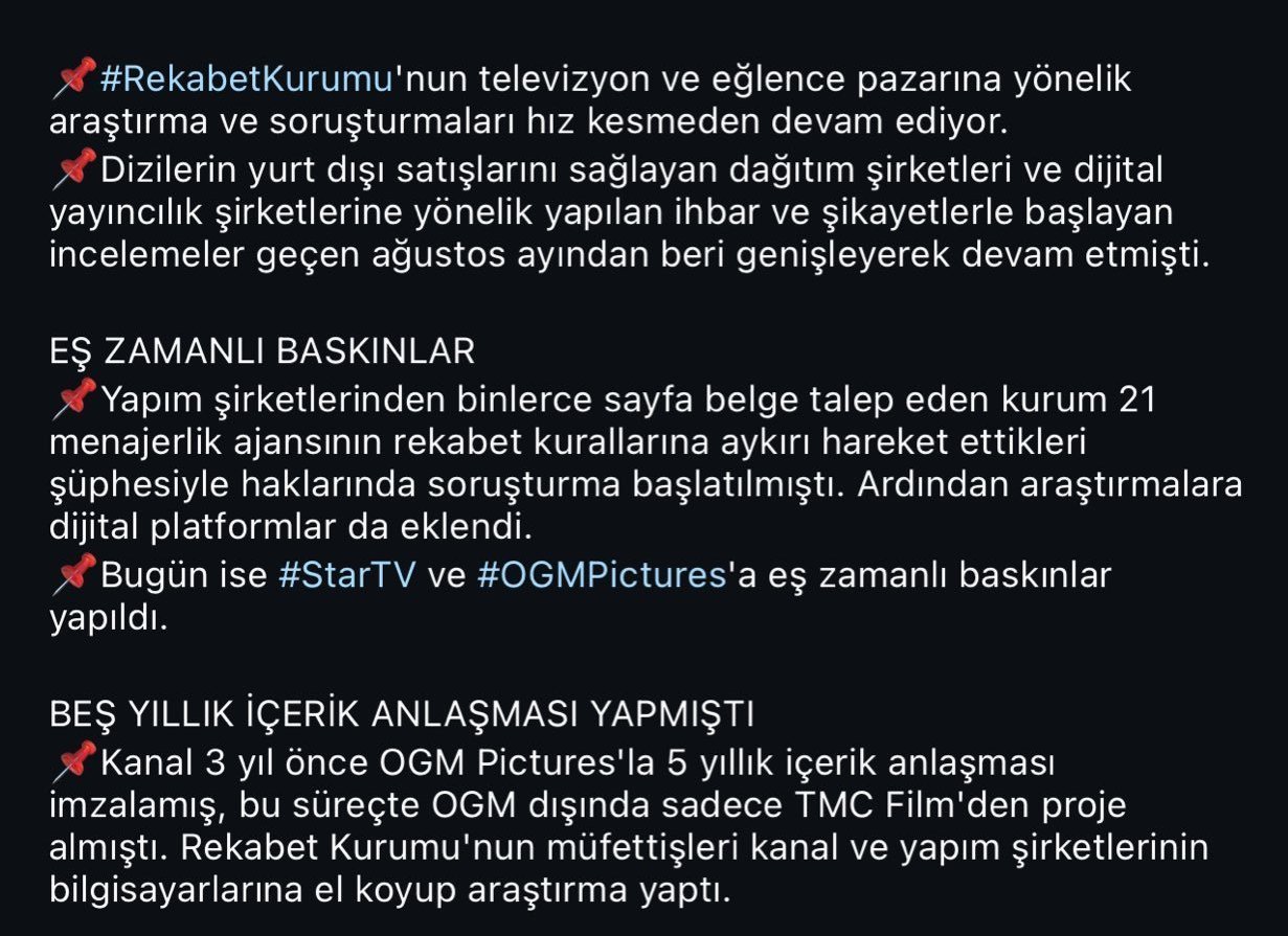 Каналът подписа 5-годишен договор за съдържание с OGM Pictures преди 3 години, по време на този процес получи само проекти от TMC Film, различни от OGM. Инспекторите на Органа за защита на конкуренцията конфискуват компютрите на каналите и продуцентските компании и провеждат разследване.