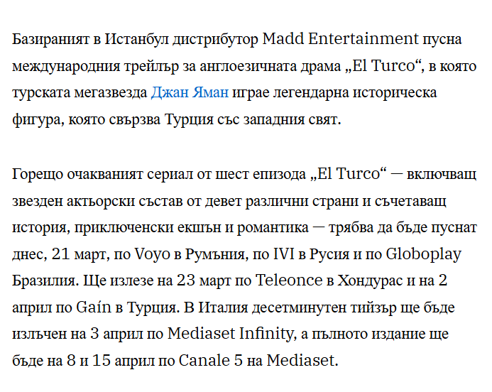 В петък, 21 март, се състоя премиерата на сериала "El Turco" с участието на Джан Яман, който ще бъде излъчен ексклузивно в Бразилия по Globoplay. Турският актьор, известен с продукции като "Господингрешен" и "Мечтателят", премина интензивно обучение, за да изиграе главната роля в новата пиеса.
