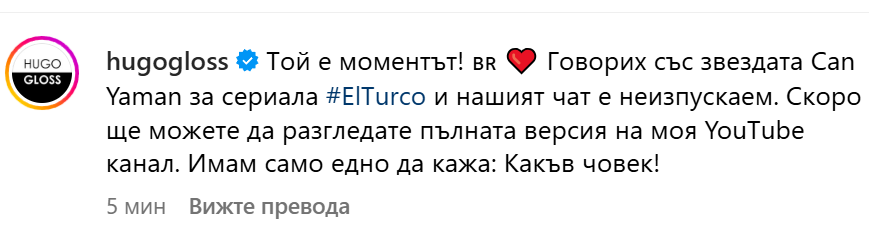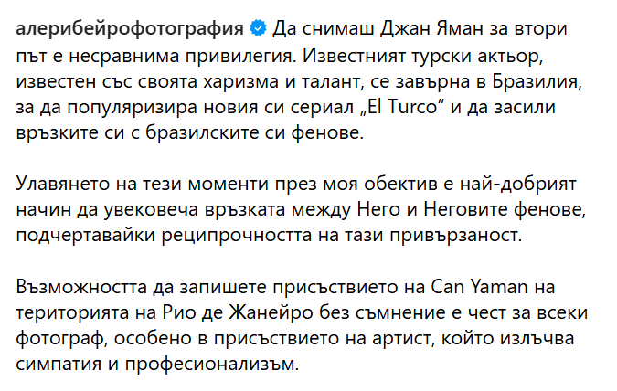 „Това е третото ми посещение в тази приказна страна. Първият път бях тук с баща ми на почивка, а вторият път беше да се срещна с бразилските фенове. Този път съм много щастлив да споделя вълнението си от новия ми проект „El Turco“. Времето, прекарано тук, винаги е било незабравимо за мен. „Сигурен съм, че и този път ще се насладя на всеки момент от това посещение“, завършва той.