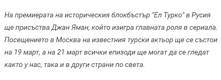 Не пропускайте световната премиера на El Turco на 21 март. В Русия на този ден всичките шест епизода на El Turco ще бъдат ексклузивно достъпни за гледане на Ivi. Можете да видите любимия си актьор и красавец Джан Яман в Москва на 19 март на представянето на блокбъстъра.