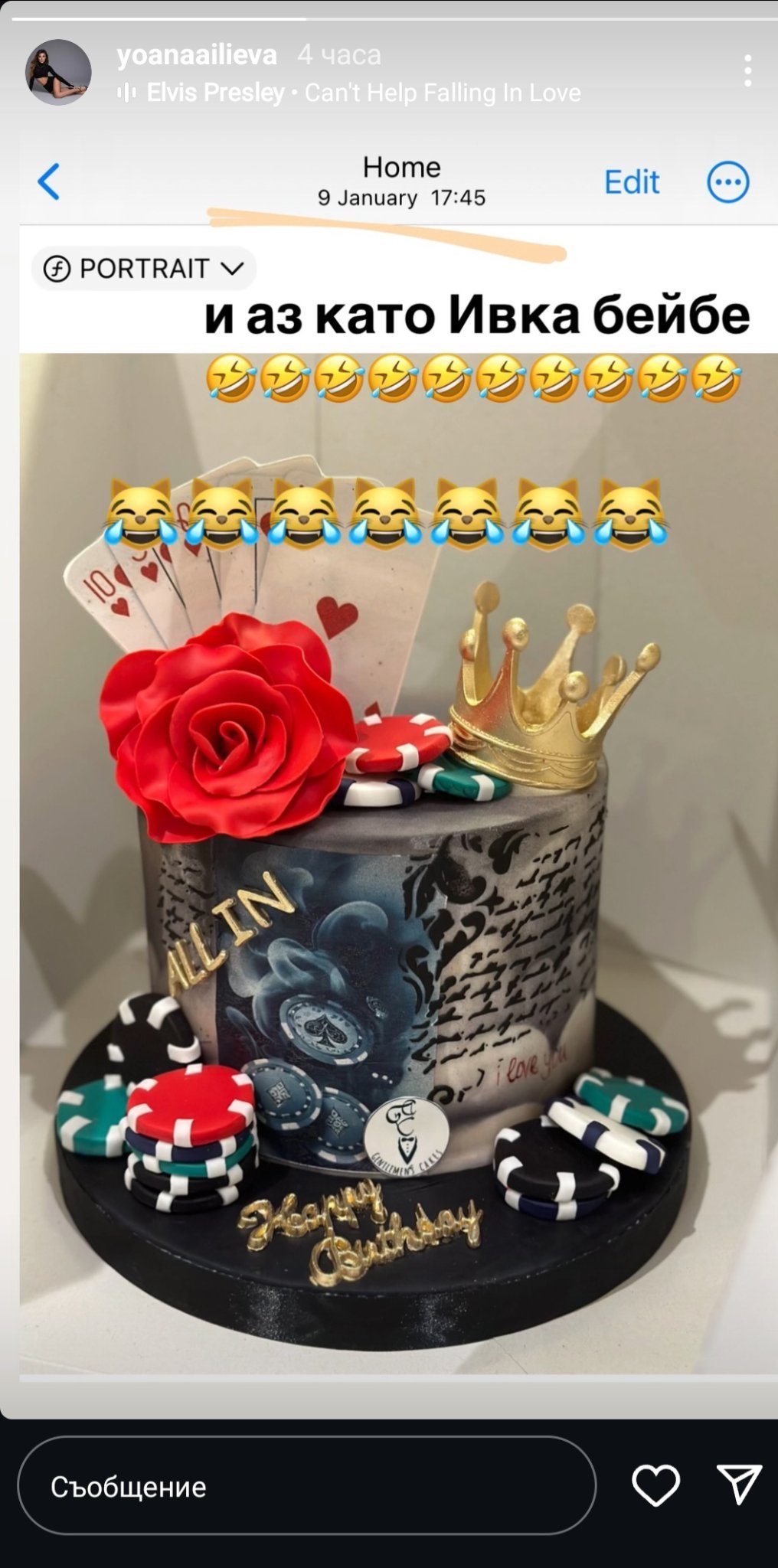 А знае ли се кога е рождения ден на Мартин? Йоана си е качила на стори скрийншот от телефона си на снимка,подчертавайки, че е от 09.01.25г а снимката е на торта с тема покер жетони и карти. Написала е "и аз като Ивка бейбе".