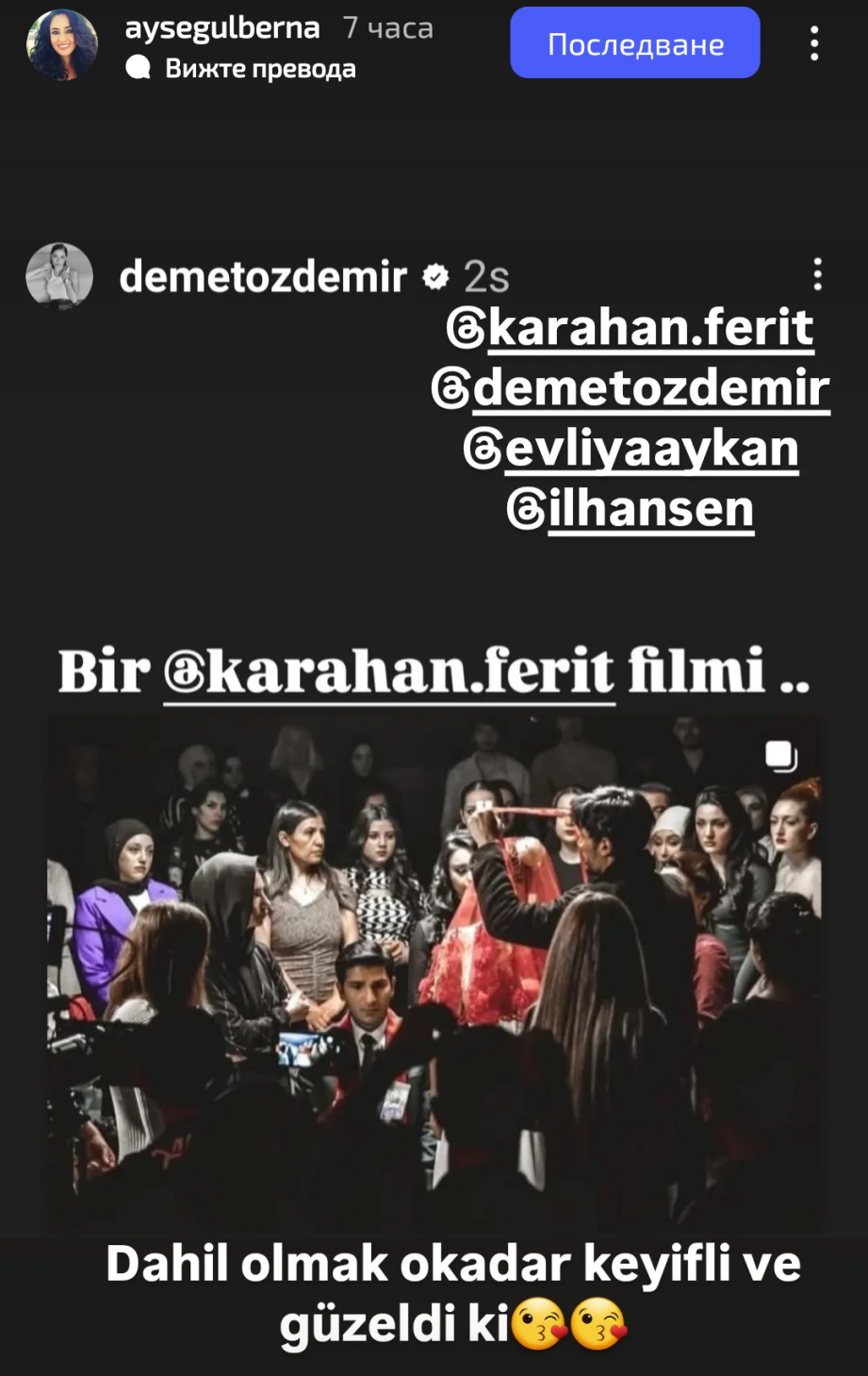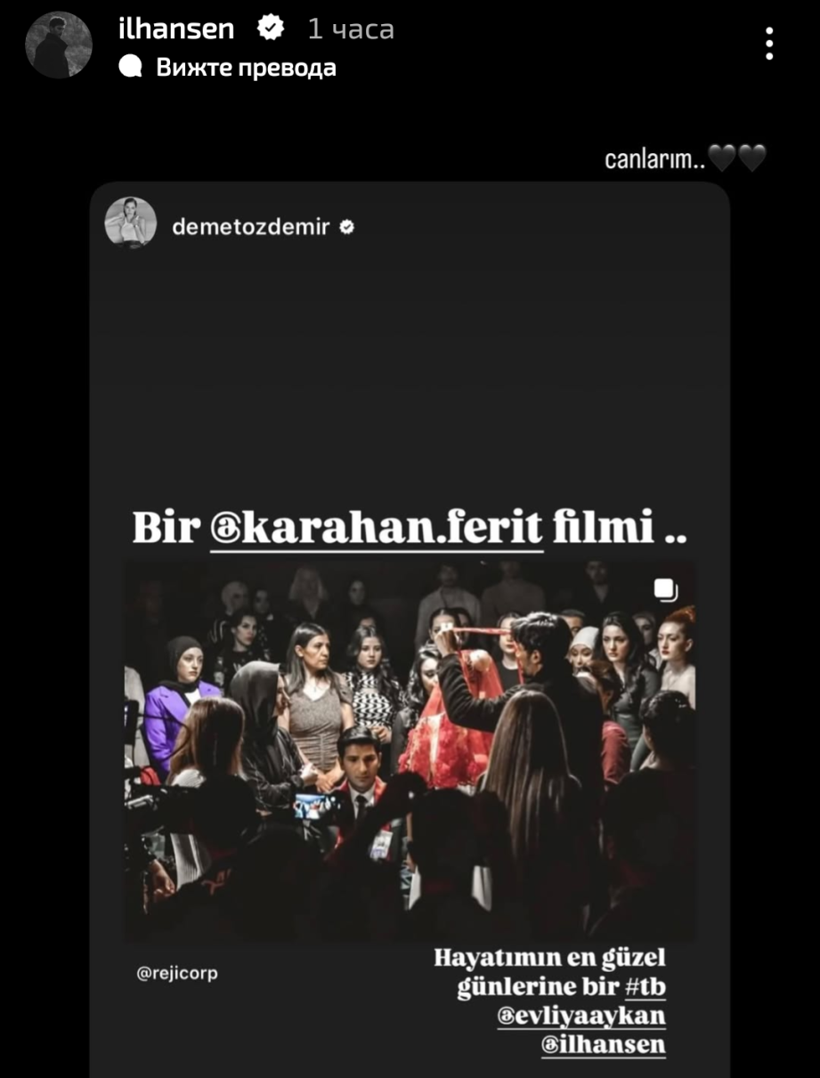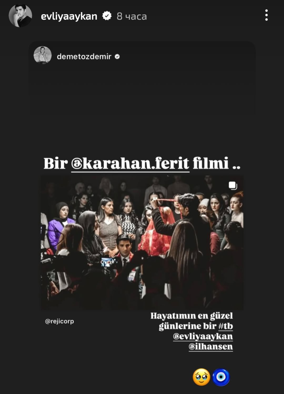 Пропуснах да спомена, че моят любимец Евлия и режисьорът Ферит Карахан споделиха публикацията на Демет за Джиновете. Даже и гримьорката Айшегюл е написала, че за нея е било голямо удоволствие, че е била част от екипа Gift Heart