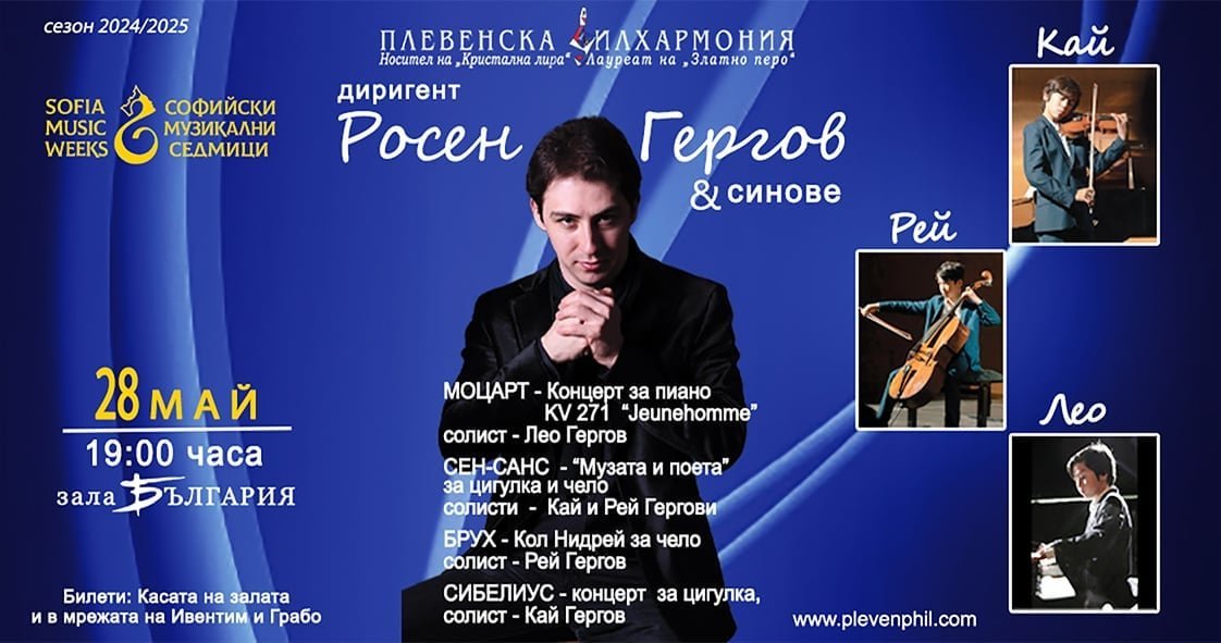 28 май, 19 ч. – Зала „България“ – Плевенска филхармония с концерт „Росен Гергов&синове“. Солисти: Лео Гергов – пиано, Рей Гергов – виолончево, Кай Гергов – цигулка, диригент Росен Гергов. В програмата: Моцарт, Сен Санс, Брух, Сибелиус.