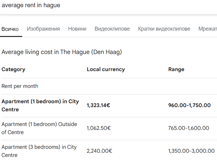 Сега наема. Бай ви Ганьо също е изръшкал немалко свят, и в Холандия е бил много пъти. 1800 за студио може и да има - на някоя специална локация. Тъй като заплатите ги вадихме от Гугъл, нека извадим и наемите от Гугъл: