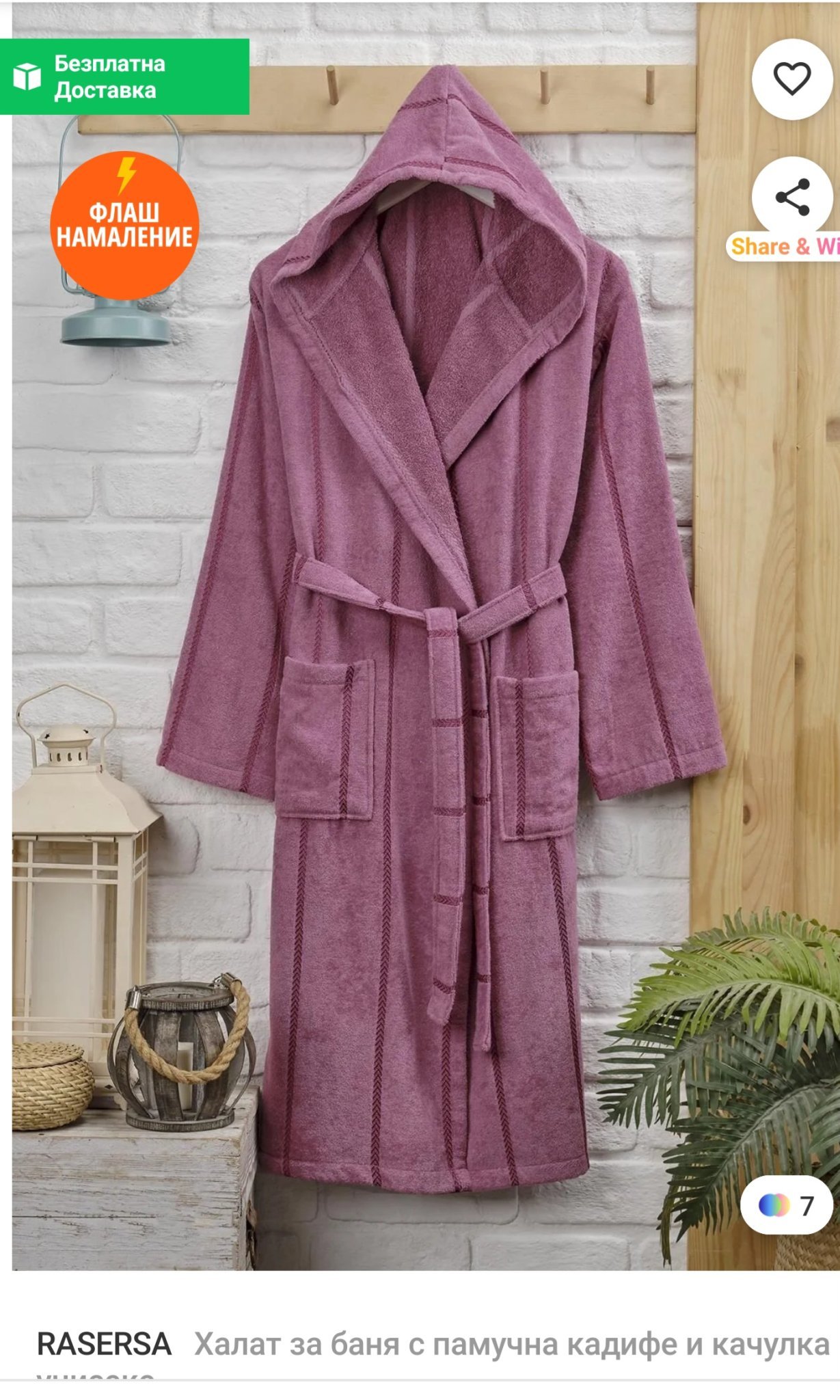 Точно този халат, от същия търговец ми дойде с различен номер от поръчаното и с дефект. Приготвих го за връщане и се отказах. Тънък е, но попива и не оставя власинки. Мама ми оправи дефекта и си го нося. 🤣 Сега чакам сив и май пак от същото място. Ще споделя като дойде.