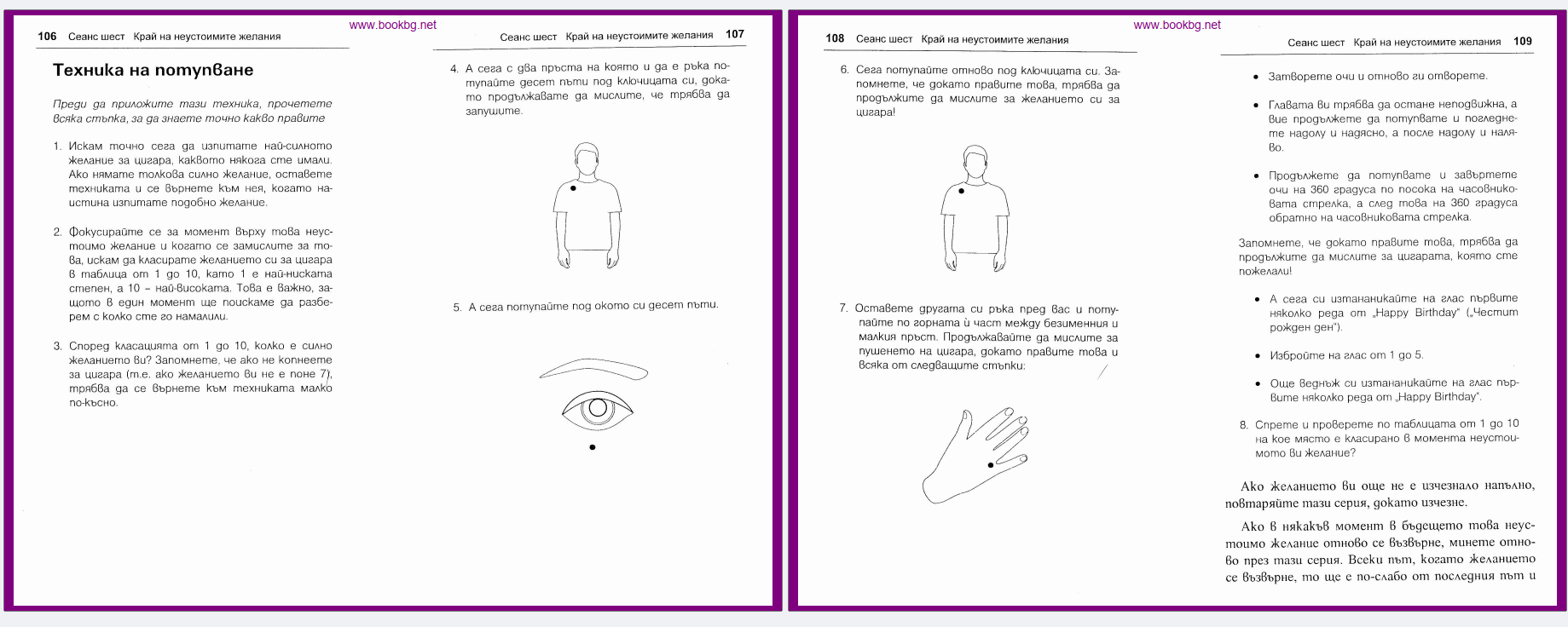 Хахаха, то ако тръгна да го правя това всичкото, ще ми мине всякакво желание за какво и да е да ти кажа, Елора 😃. Само като се опитах мислено да ги направя всичките тези потупвания и желанието намалява, но по-скоро си мисля, че е защото мозъкът веднага сменя фокуса за изпълнение на тези стъпки, които са му несвойствени. А иначе, сигурна съм, че това са някакви специфични акупунктурни точки.