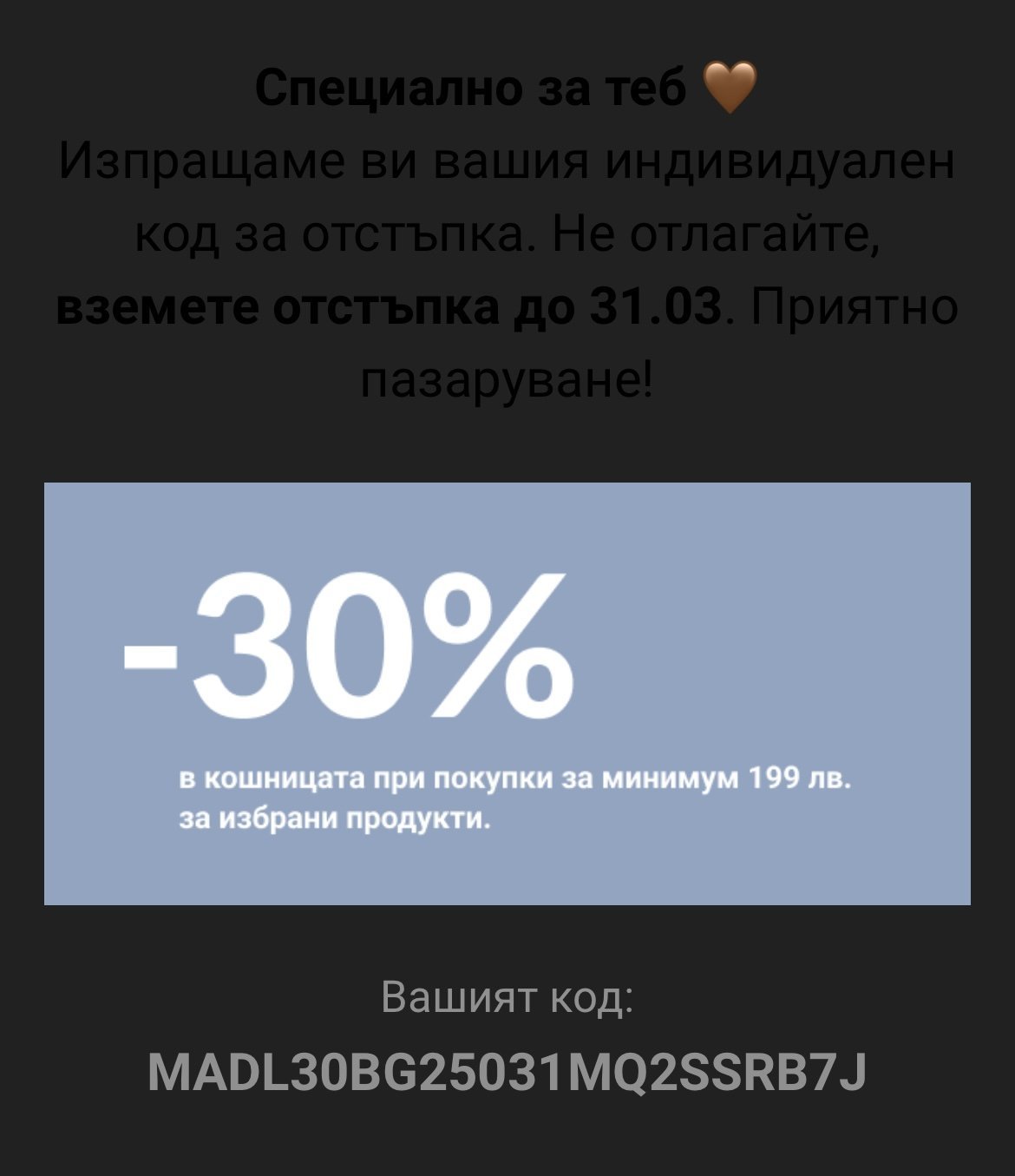 Код за Modivo - 30% за поръчки над 199 лева. Важи до 31.03.25