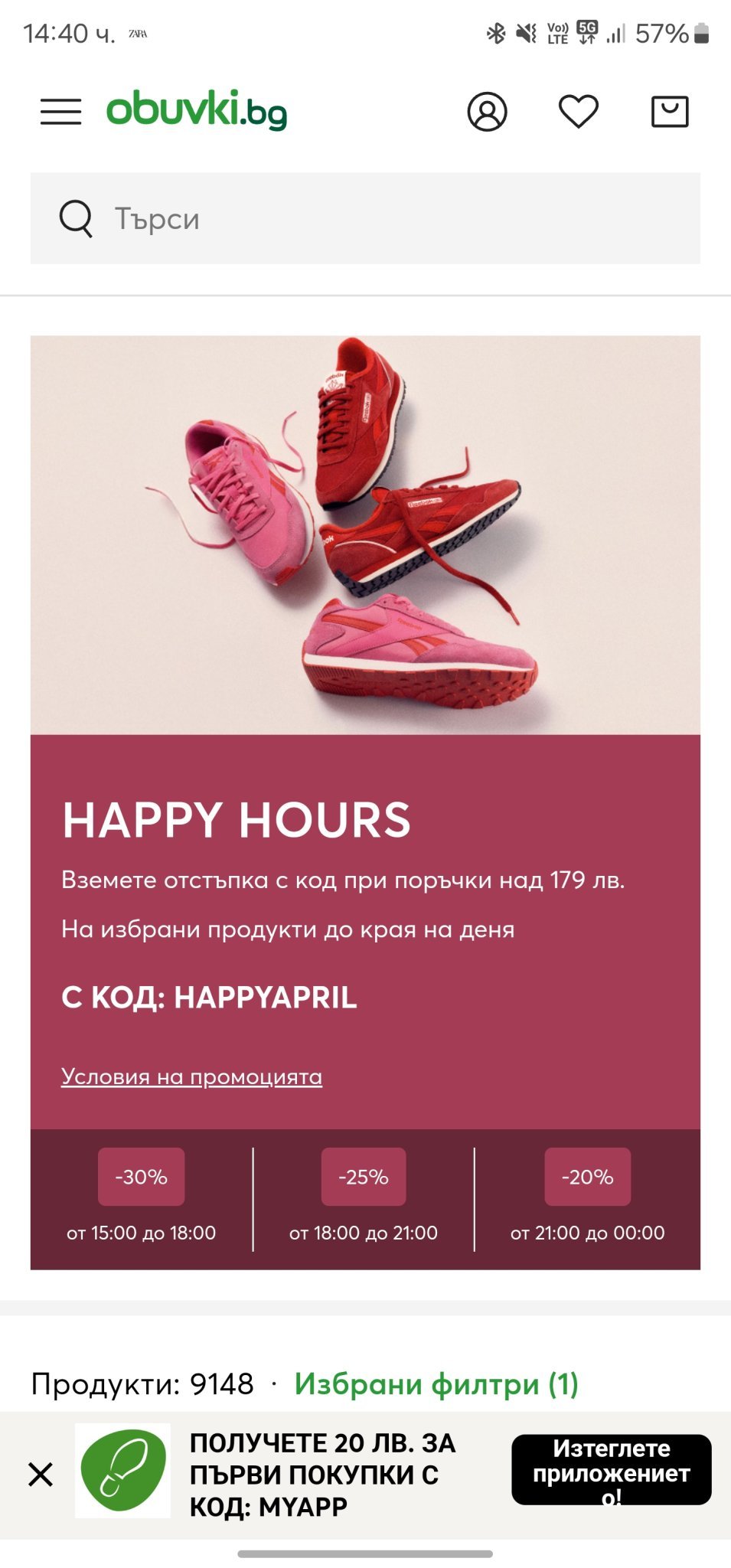 В 15:00 пускат -30% в обувки бг. На няколко часа отстъпката ще намалява на 25% и на 20%. Получих мейл.