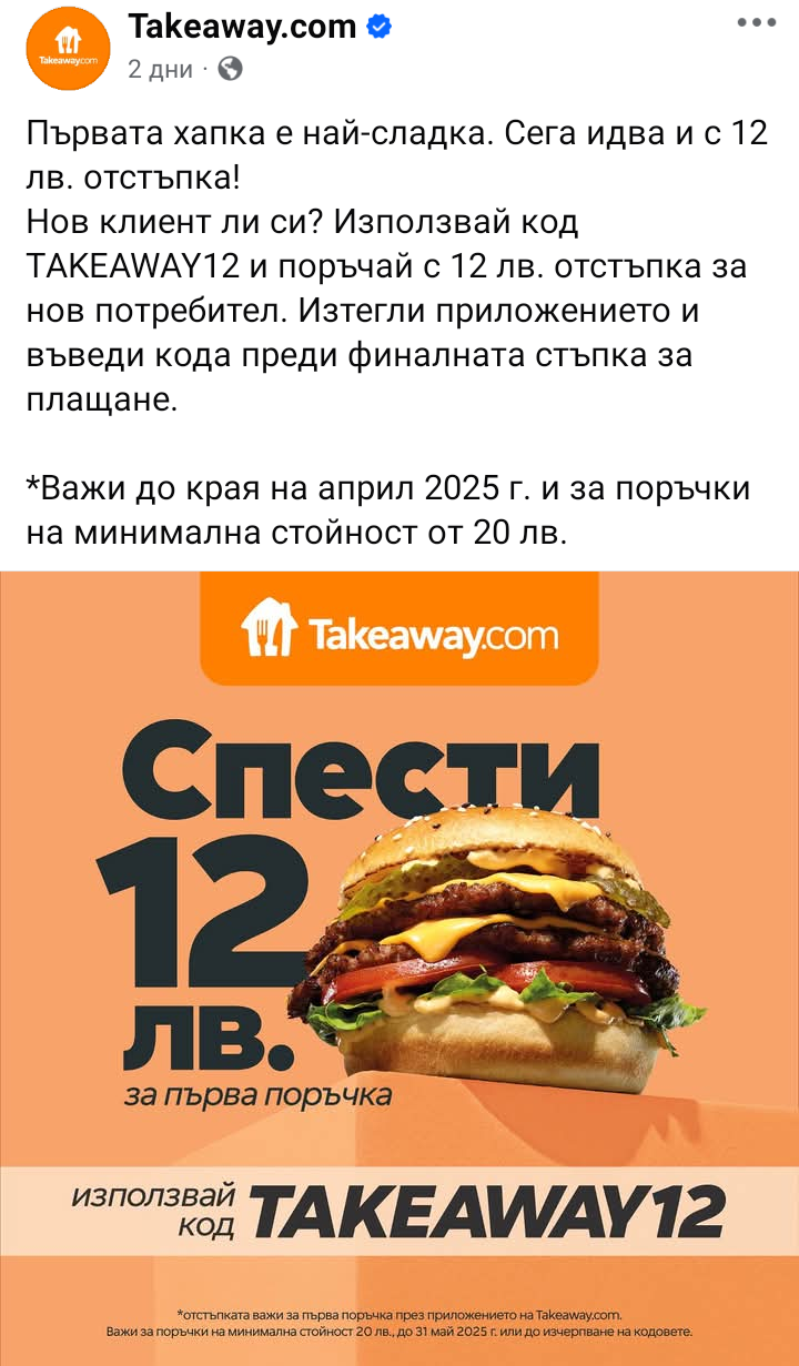 Код Takeaway за нови клиенти:
