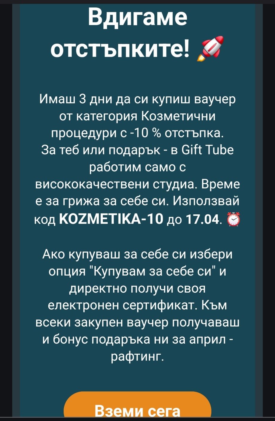 Имам купон за Ориндж, 10 лева, при покупка над 50 лева, валиден до 15.04. Пишете ми, ако Ви върши работа.