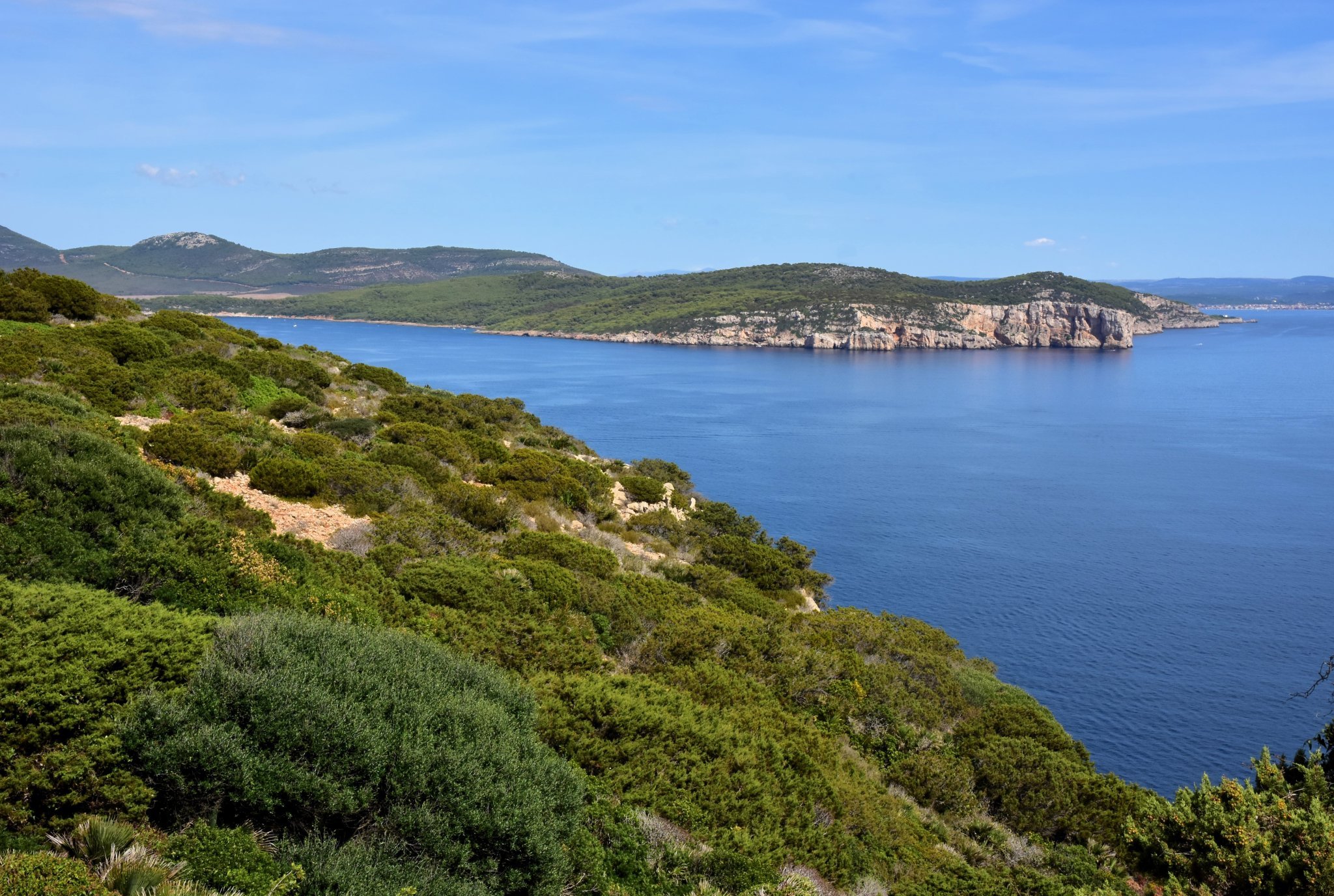 Ден 7 плажувахме на него. Но преди това обходихме полуостров Капо Кача, национален парк, в чийто край се намира известната пещера на Нептун. Тя може да се достъпи с корабче от Алгеро, с по-кратко плаване от заливчето Кала Драгунара, но и с кола/автобус и слизане пеша по 650 вити стълби. Разбира се, качването е по-трудната част. На полуострова има малки закътани заливчета, но също пренаселени.