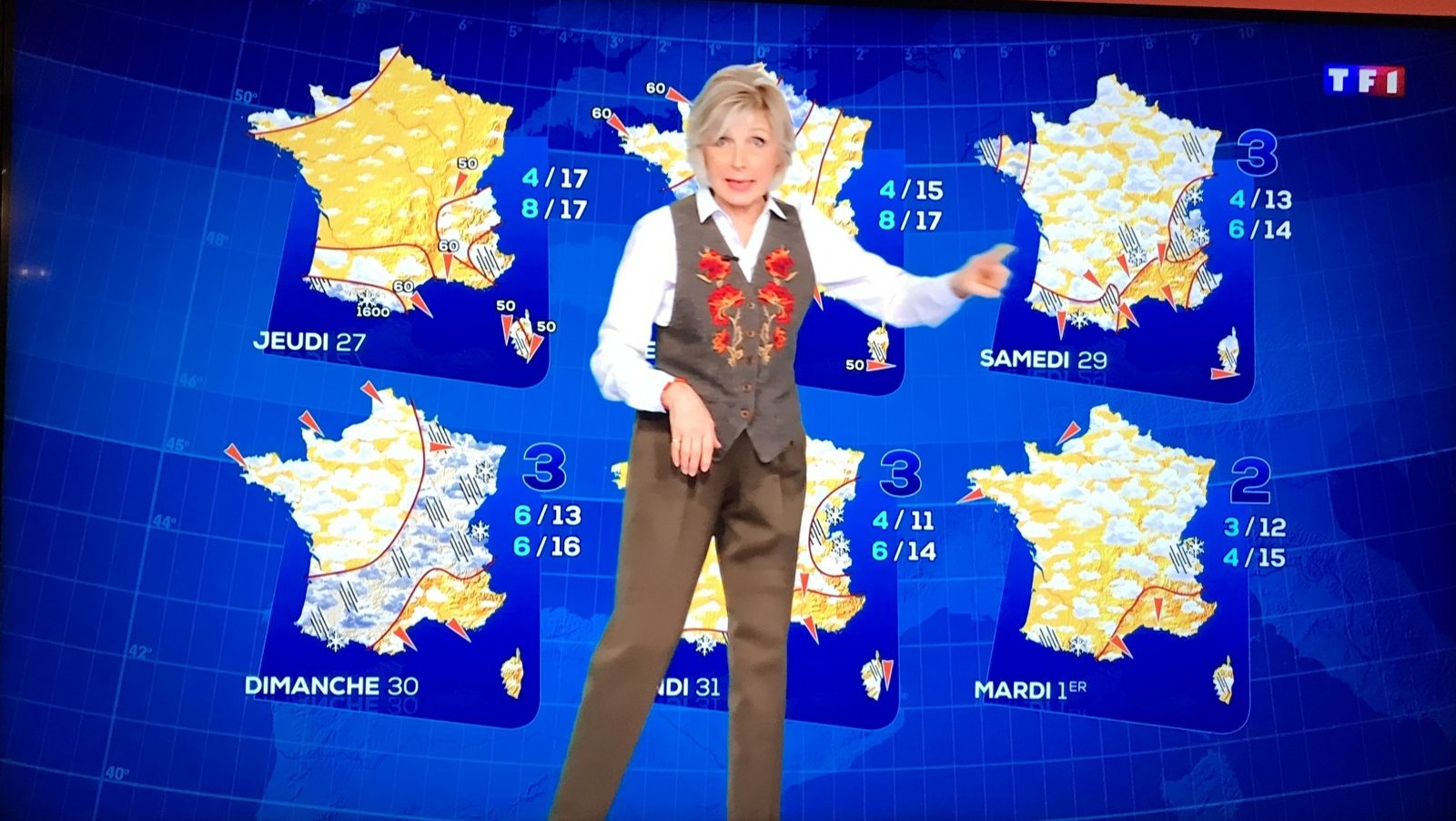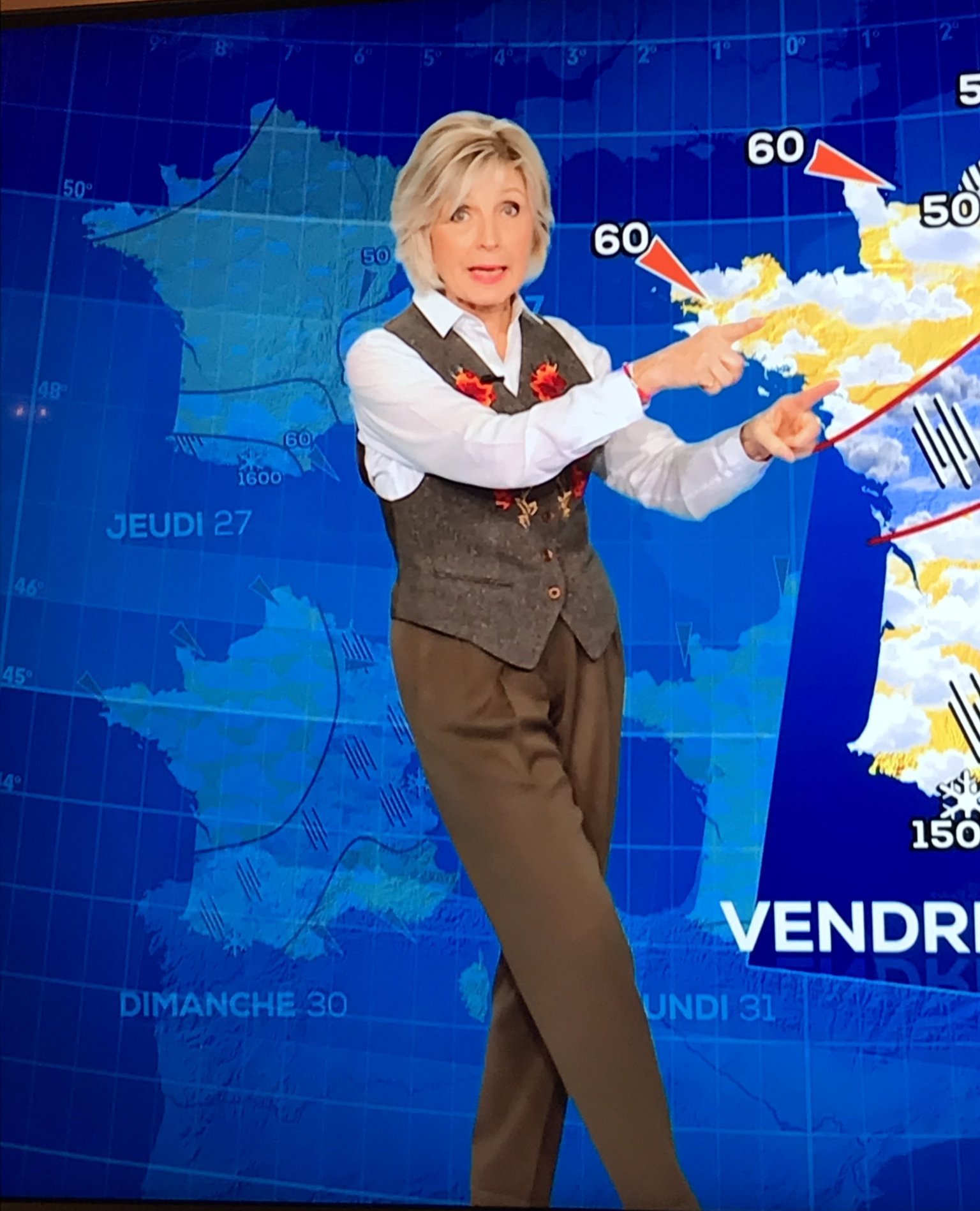 Щракнах специално за вас, с тоалет с панталон по ИвСенЛорански, 77 годишната “четяща прогнозата за времето” Евелин Делиа по първи TF1, за която ви говорих преди време.