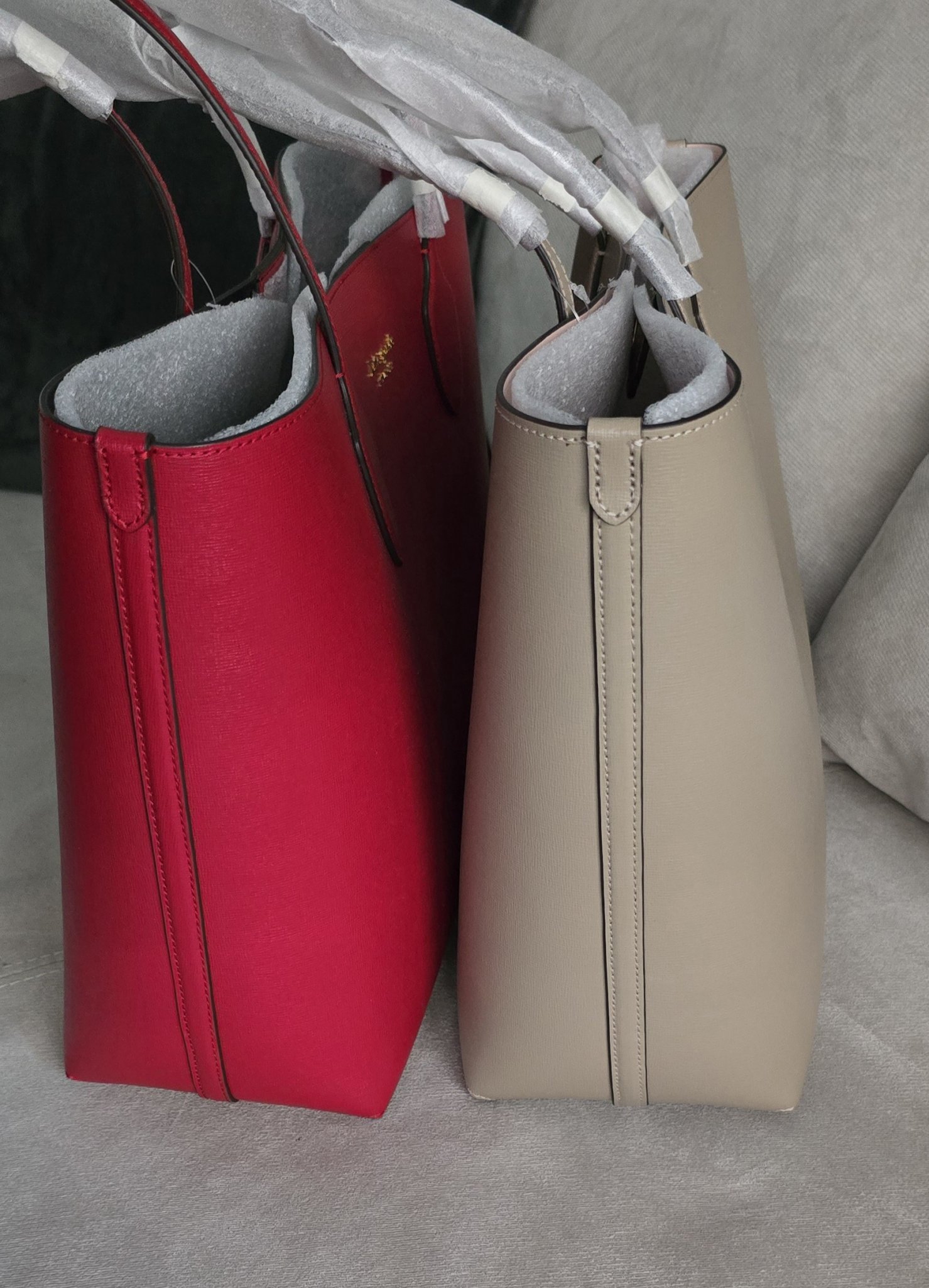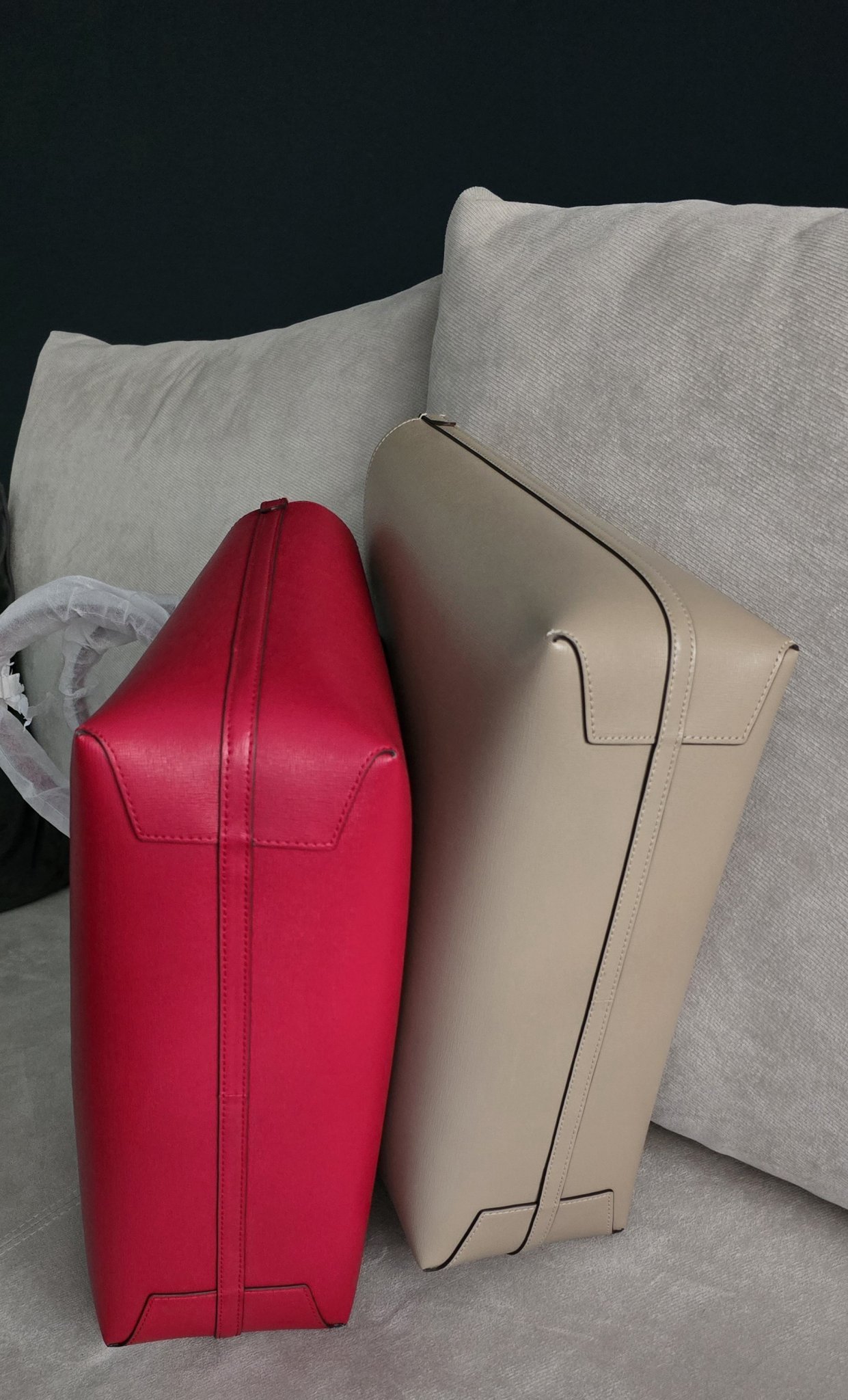 Телешка сафиано кожа, устойчива на петна и надраскване, без хастар,  дръжки, които не се изплъзват, удобни за носене на рамо,  лакът или дори в ръка. Елегантни както за поводи, така и за ежедневието с много красив финиш. Голяма - побира 13" лаптоп + много други неща, но изглежда спретната и фина, запазва форма. Лека е, и двете са по- меки и гъвкави от "мартеницата".
