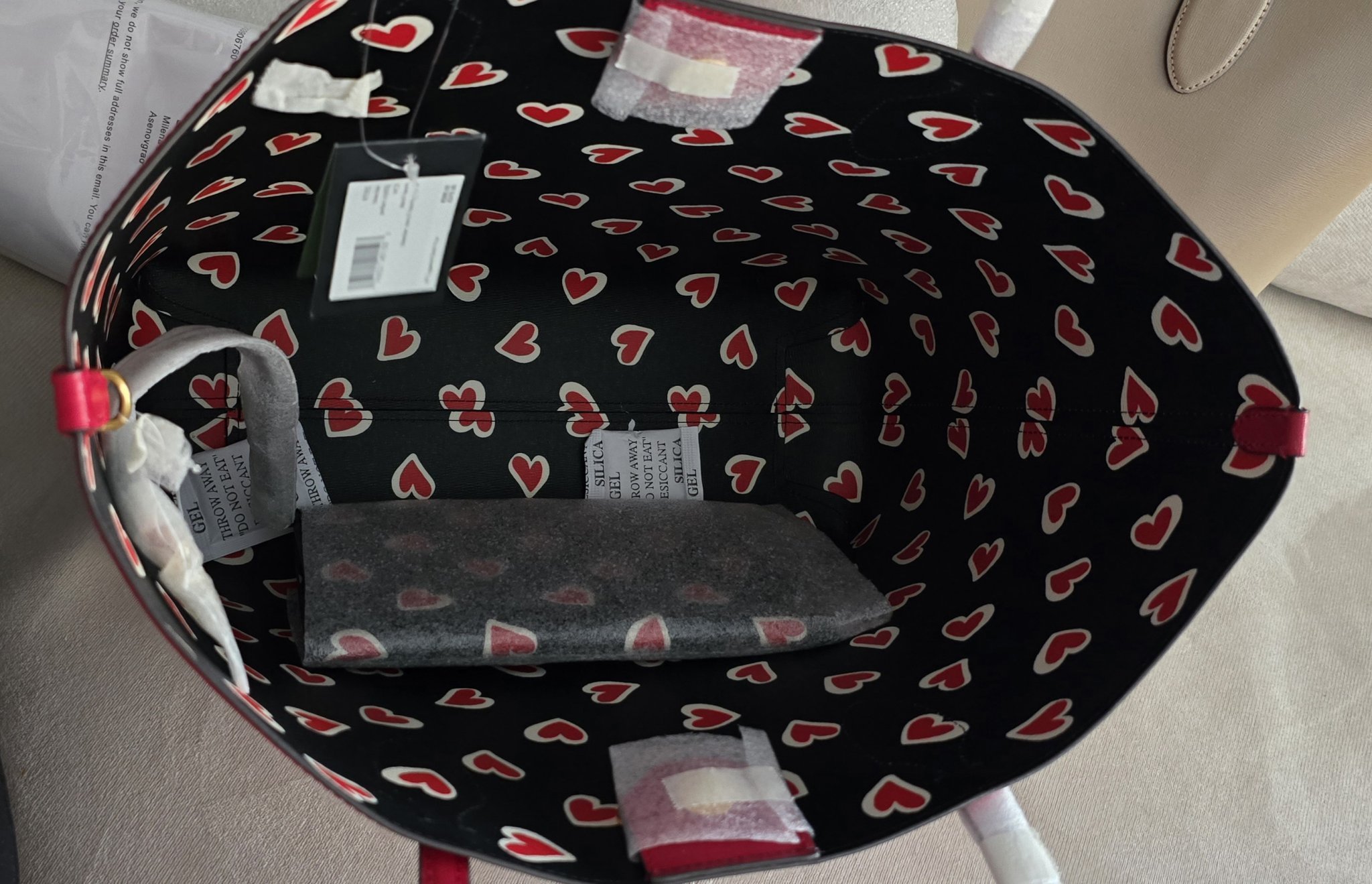 Продължавах да се оглеждам за модела и попаднах на Bleeker Stencil Hearts Pop - червена с принт на стенсилирани сърца в Best Secret- поръчах я на по- добра цена и върнах първата към АЮ. Това беше моята червена чанта и първата ми поръчка от тях.