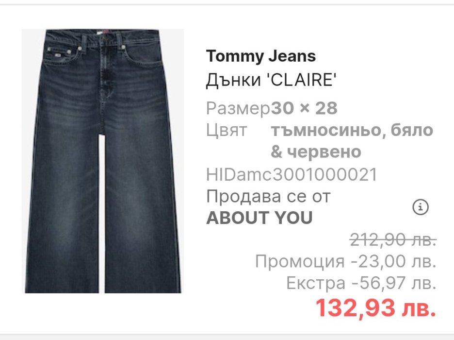 Получих тези дънки на Томи..стоят перфектно..точно каквото търсих са. Леко умалени ми идват защото нося 29, но нямаше и поръчах 30 и са ми съвсем точни. Дължина 28 за моят скромен ръст идва също перфектна и стига точно до подметката на обувката..без да се влачи и без да е късо. Радвам се че няма да подгъвам Simple Smile)