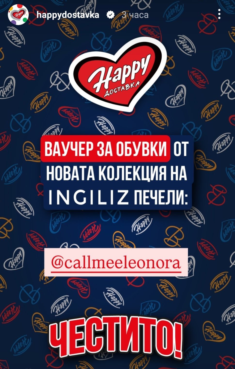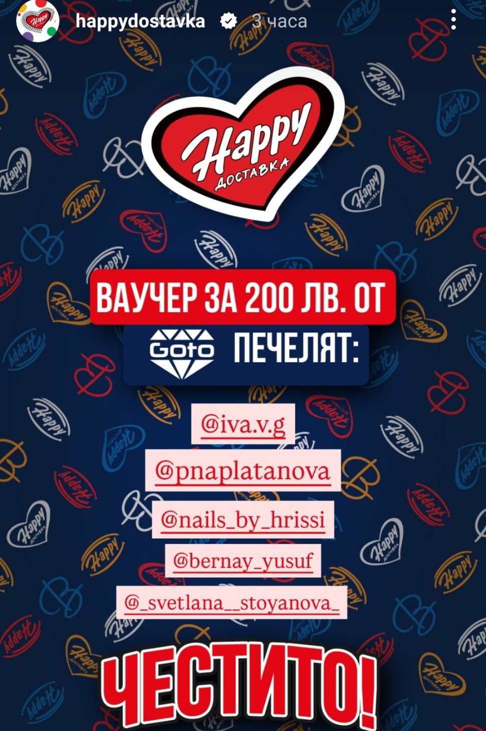 Аз съм от печелившите от Хепи, от малките награди. 😊 Много се зарадвах, отдавна не бях виждала в Инстаграм "Честито".