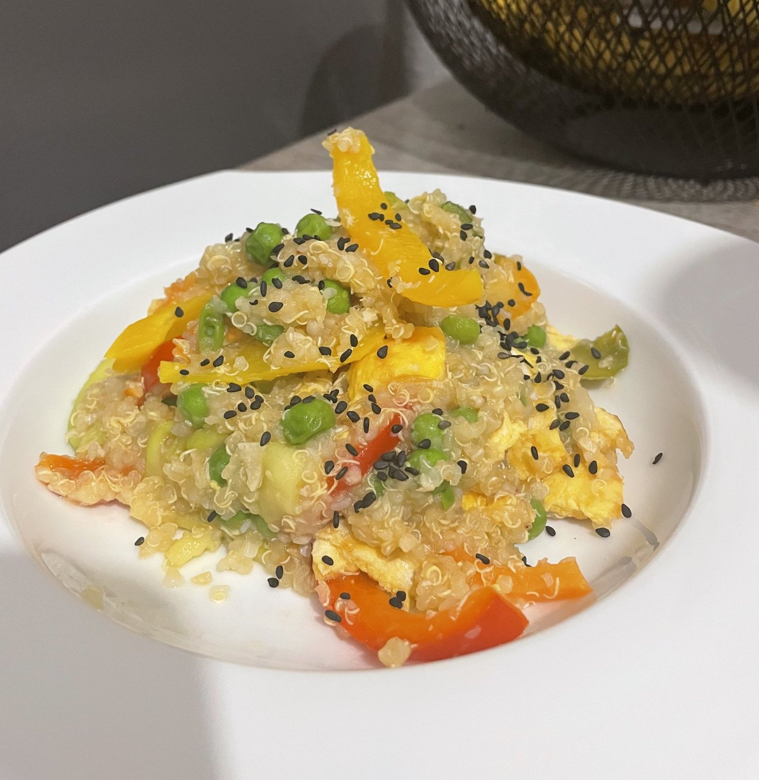 Днес за вечеря има елда и киноа със зеленчуци,омлет на парченца и соев сос.