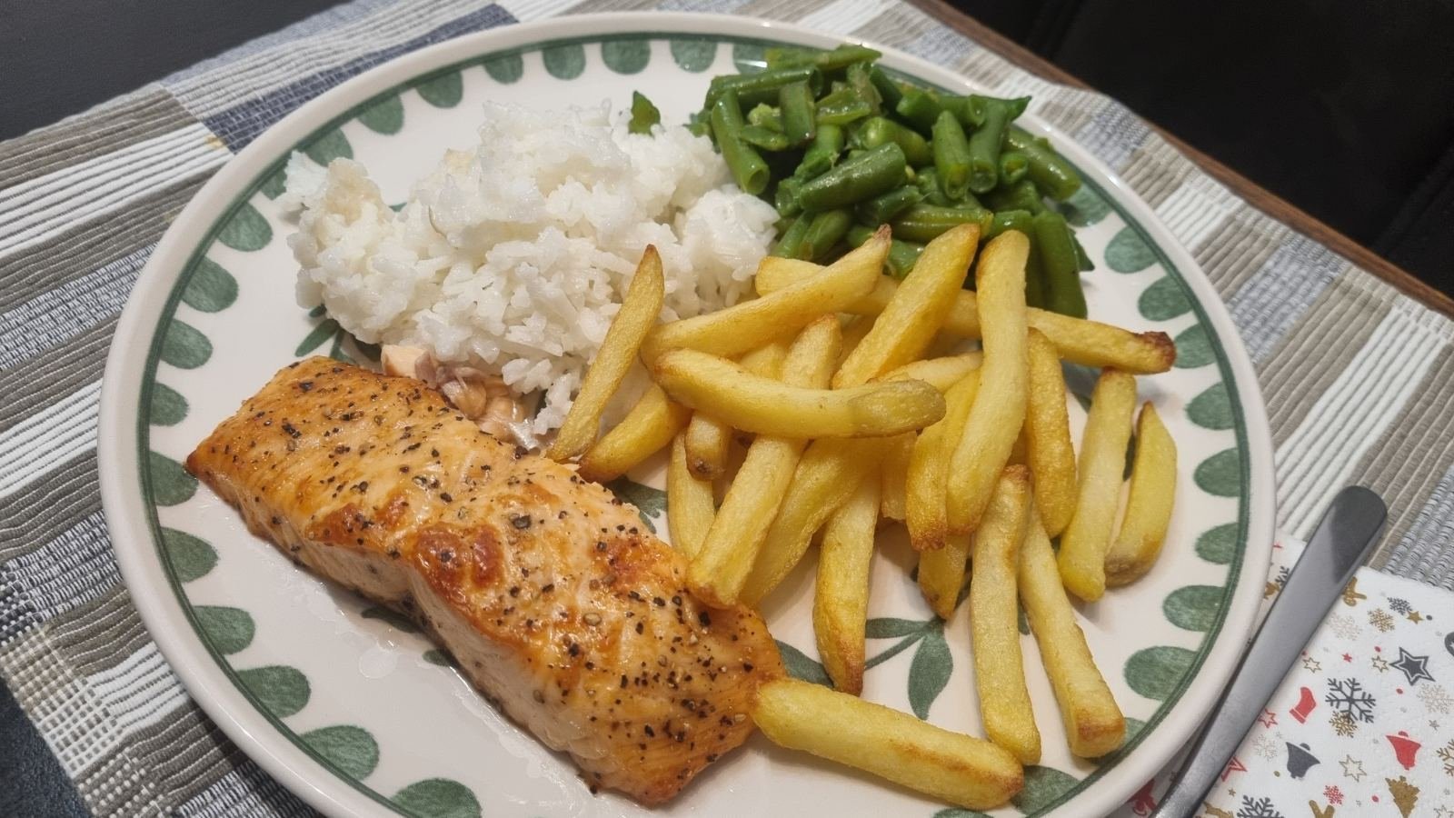 Сьомга, мерджемек/ супа от червена леща/ и яйчица със сланинка.