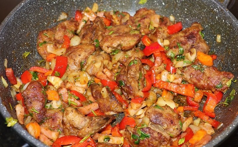 Пържени пилешки дробчета с бекон и зеленчуци