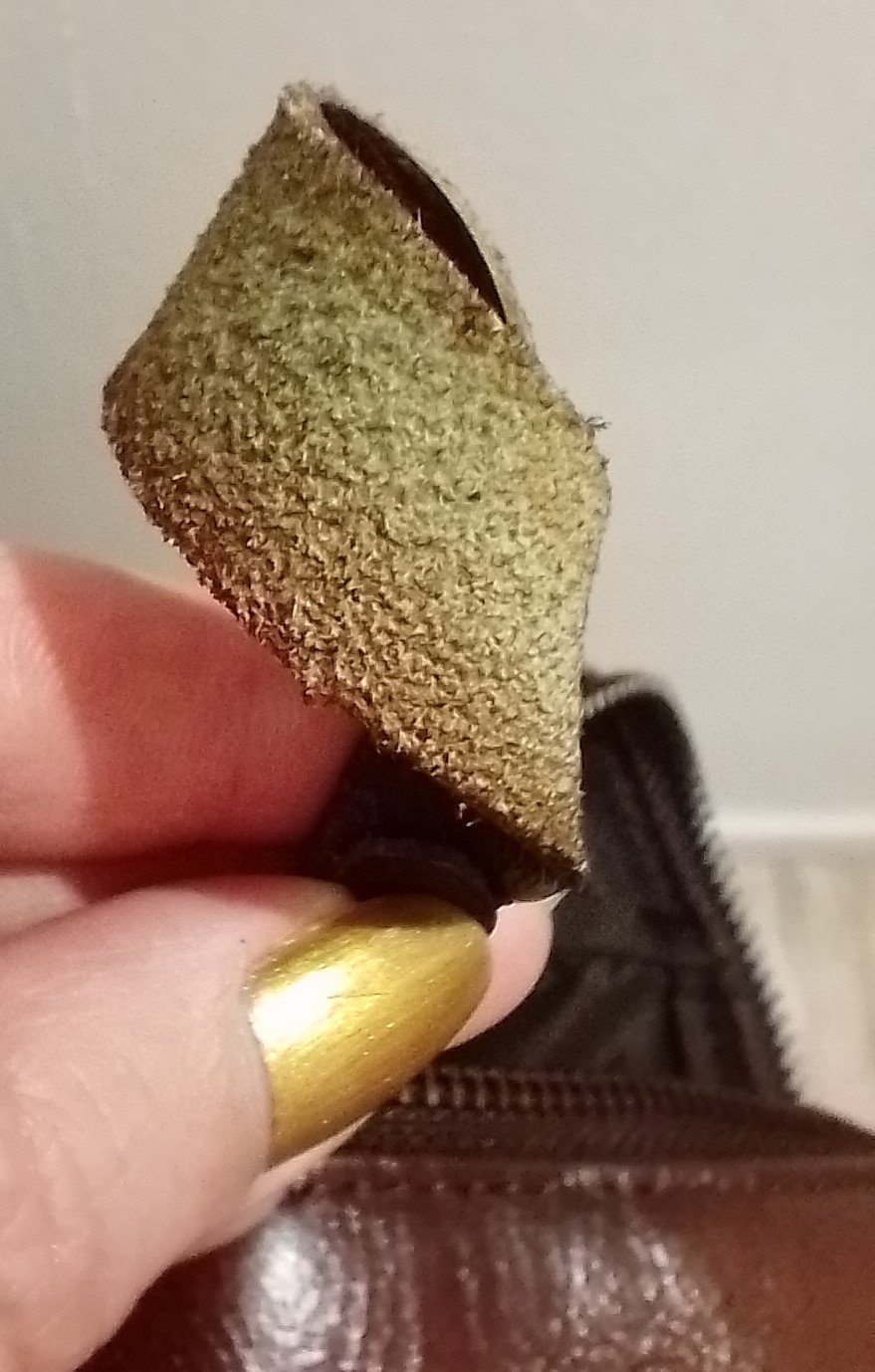 Хич не разбирам от кожи, обикновено предпочитам изкуствена кожа, но тук много ми хареса цвета и особено дизайна с вълните. Вижда се само на ципа каква е кожата от другата страна, но ми се струва, че така би трябвало да изглежда естествената кожа: