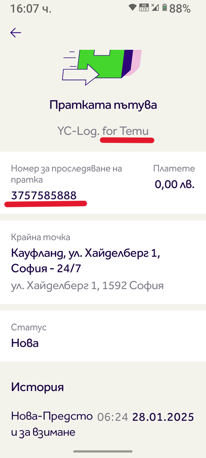 Много внимателно проверих номера на на всяка пратка от Тему, но нямам такава. А и доста време мина, сега най-старата пратка, която очаквам, е направена на 18.02, а тази е от 28.01. Засега това не е проблем, защото нямам липсваща пратка, притеснява ме това, че е направена поръчка с моите данни, защото няма как иначе в Бокса да получат тази информация за очаквана пратка. Ето този скрийншот им изпратих в чата на Тему, като те не разбраха какъв точно е проблемът, но поне ще има дигитална следа, че съм се опитала да разбера какво става Simple Smile