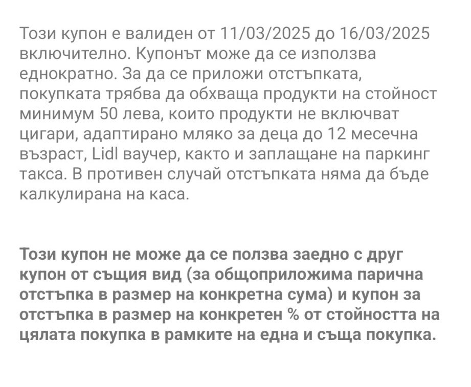 Някои клиенти съобщават, че отстъпката от 50% се прилага само за определени артикули, като кучешка храна и нудли. Въпреки това, други продукти също се считат за част от промоцията, въпреки че може да е необходимо да се разгледат етикетите в магазина за по-голяма яснота. Потребителите препоръчват внимателно да се прегледат предлаганите артикули, за да се оцени напълно стойността на промоцията.