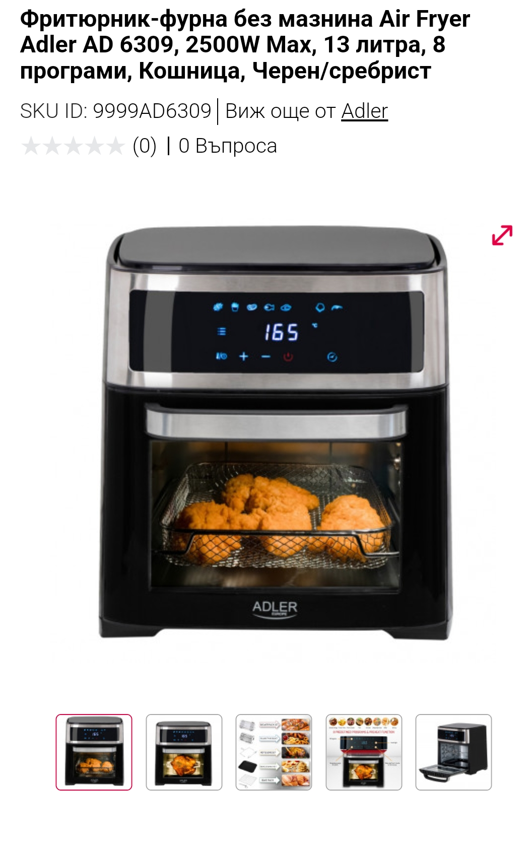 аlllllimei, уред с квадратна или правоъгълна форма отвътре е по-функционален според мен. Казах за пицата, понеже на една от снимките с аксесоари е показана и пица.🙂 Иначе пица с блат от гръцките питки ще влезе почти във всеки фрайър. Първият ми фрайър беше от Лидъл с чекмедже/кошница. 1650 или 1700 вата беше. Много го използвахме, но му се развали един прекъсвач след години употреба и вече не се самоизключваше всеки път при отваряне или пък на края на печенето. Което си беше опасно (особено за детето) и затова го сменихме с уред тип фурничка от Кауфланд. А наскоро си взехме и още една фурничка, която е още по-добра (освен че храната става още по-добре в нея, доста повече съдове се побират вътре, което си е голям плюс). Това е: