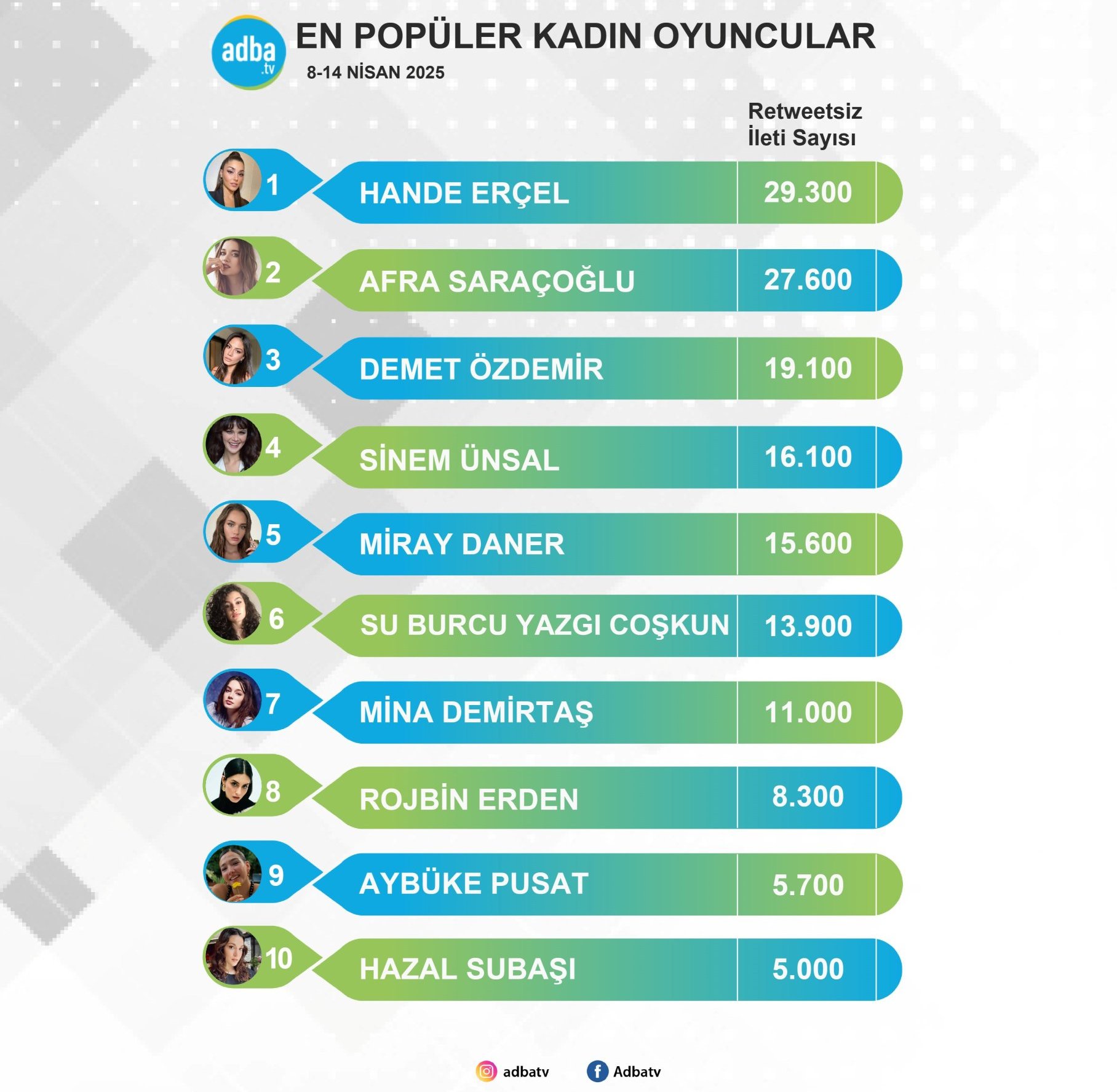 Адба обяви кои  са най-популярните актриси в социалните мрежи за периода 8-14 април. Ханде е № 1 Trophy