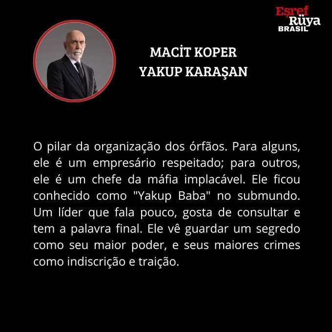 YAKUP KARAŞAN:Стълбът на сираческата организация. За някои той е уважаван бизнесмен; за други той е безмилостен мафиотски бос. Той стана известен като "Якуп баба" в подземния свят. Лидер, който говори малко, обича да се съветва и има последната дума. Той вижда пазенето на тайна като най-голямата си сила, а най-големите си престъпления като недискретност и предателство.