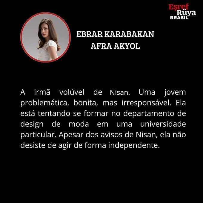 AFRA AKYOL:Непостоянната сестра на Нисан. Проблемна, красива, но безотговорна млада жена. Опитва се да завърши специалност моден дизайн в частен университет. Въпреки предупрежденията на Нисан, тя не се отказва да действа самостоятелно.