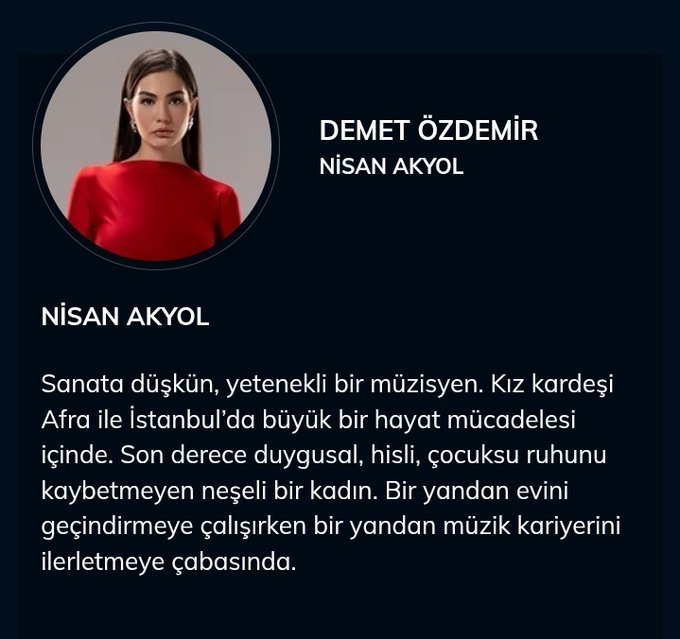 NİSAN AKYOL:Талантлива музикантка, която е в голяма борба за живот в Истанбул със сестра си Афра, която е изключително емоционална и не е загубила детския си дух, от една страна, тя се опитва да развие музикалната си кариера