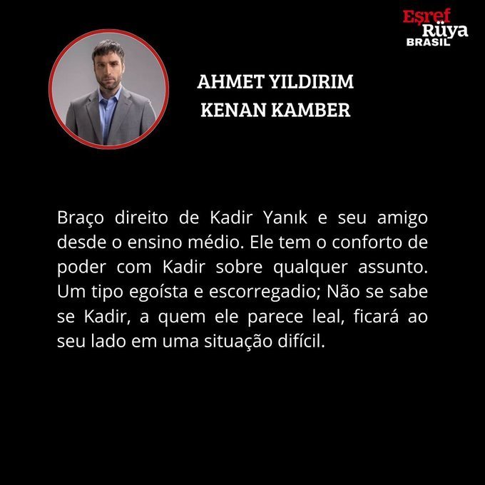 KENAN KAMBER:Дясната ръка на Кадир Янък и приятел от гимназията. Той има комфорта на властта с Кадир по всеки въпрос. Егоистичен, хлъзгав тип; Не е известно дали Кадир, на когото той изглежда лоялен, ще застане на негова страна в трудна ситуация.