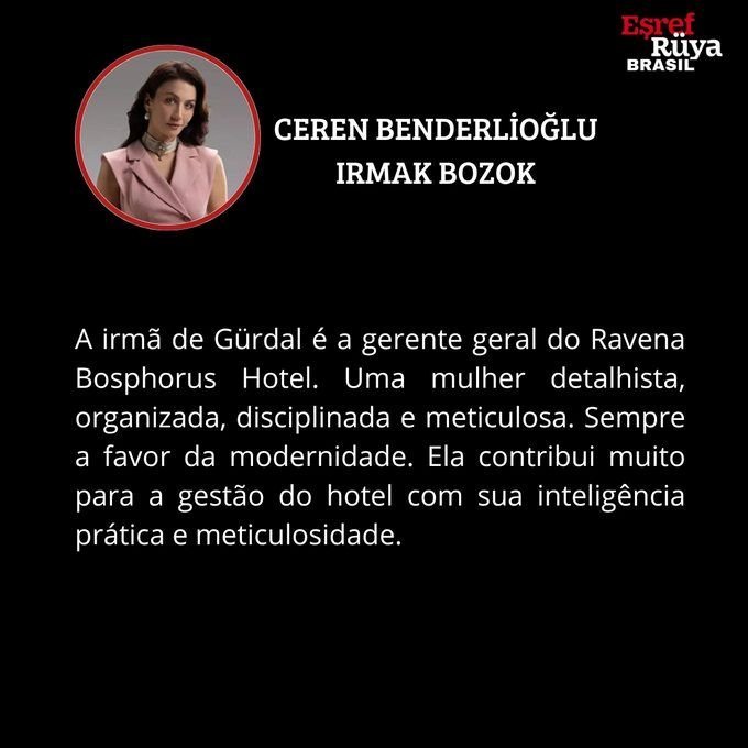 IRMAK BOZOK:Сестрата на Гюрдал е генерален мениджър на хотел Ravena Bosphorus Hotel. Ориентирана към детайла, организирана, дисциплинирана и педантична жена. Винаги в полза на модерността. Тя допринася много за управлението на хотела със своята практическа интелигентност и педантичност.
