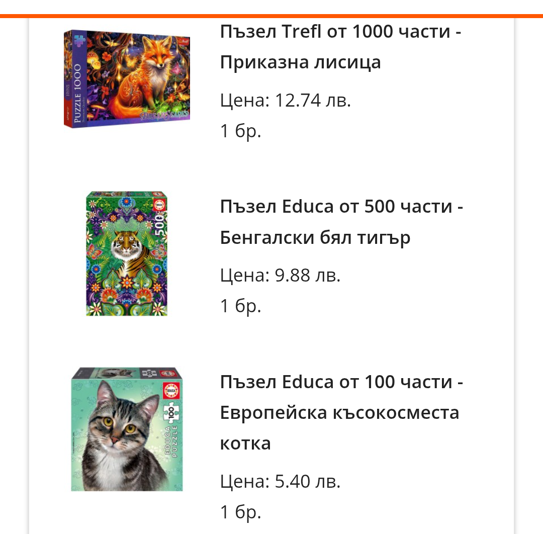 От Озон е закупен пъзела.  Последно като проверявах при тях големите пъзели този беше изчерпан. Предполагам ще пишем на Озон като магазин/ доставчик и на Трефъл като производител. Като ровех в сайта на Трефъл гледам, че до 3 липси ги изпращат. В нашия случай предполагам ще ни изпратят нов пъзел, което в момента мен лично не ме устройва. Този конкретен пъзел ми се " отреди" макар все още да си играем с него. И да получа нов такъв пъзел едва ли ще го започна отново. Трябва много да ме убеждават, че да склоня да извърша такъв подвиг. 🙂