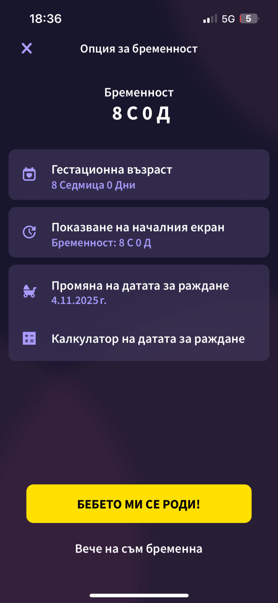 Lookatthestars11, и аз забелязах, че датите ни съвпадат. На мен приложението ми го изчисли 05.11, че не успяхме да се споразумеем. Та ми го дава, че тъкмо съм завършила 7 г.с. и утре го дава 7+1, тоест почвам 8-ма. Доста е объркващо смятането на седмиците.