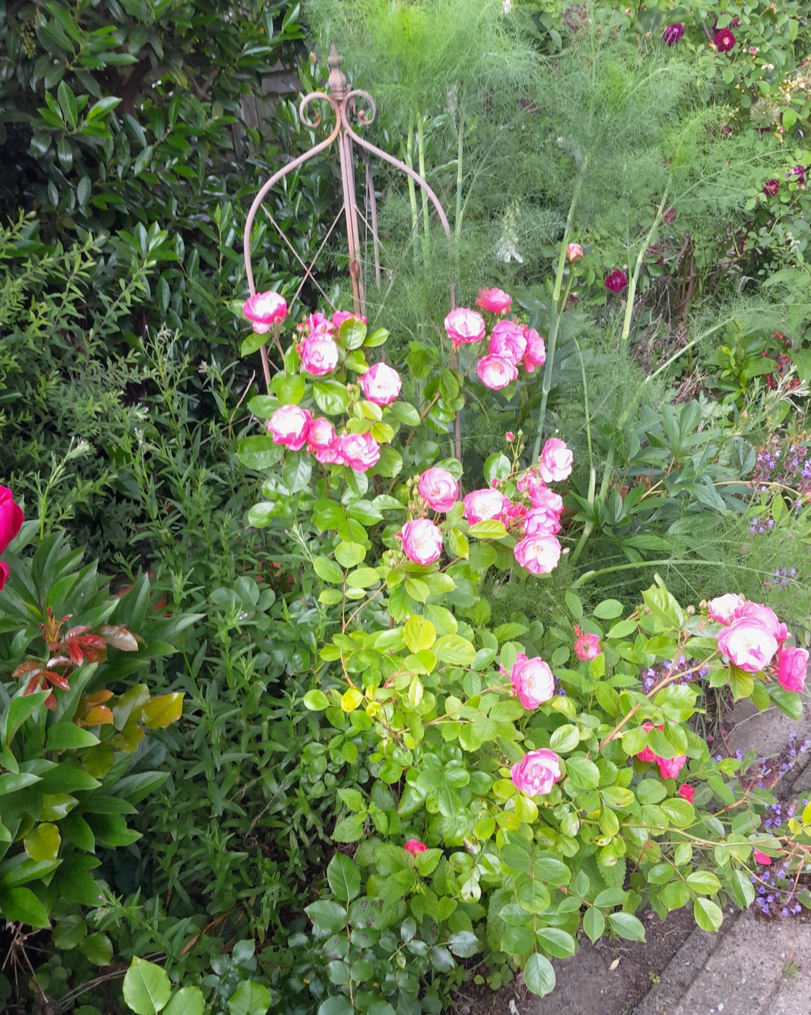 Ей тук зад розата се виждат няколко стръкчета. Жестоко орязан, преди това  розата почти не се виждаше от него.