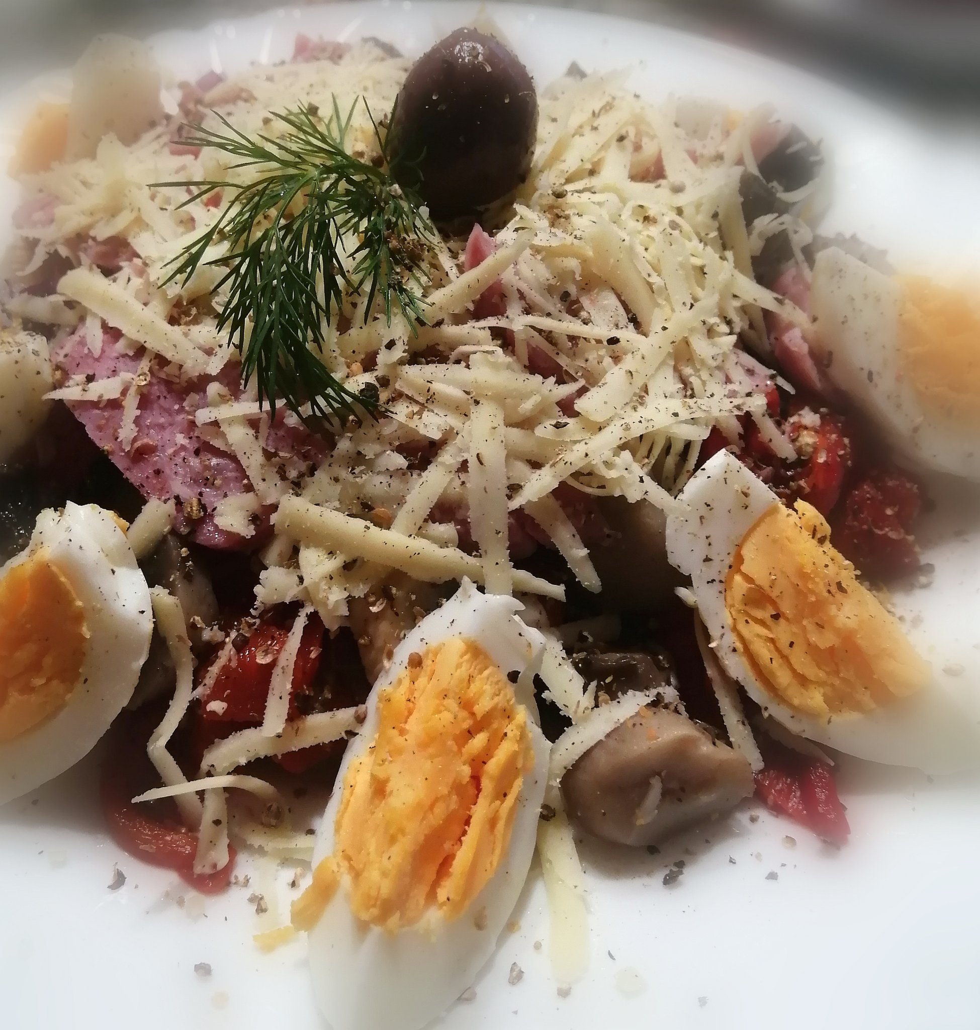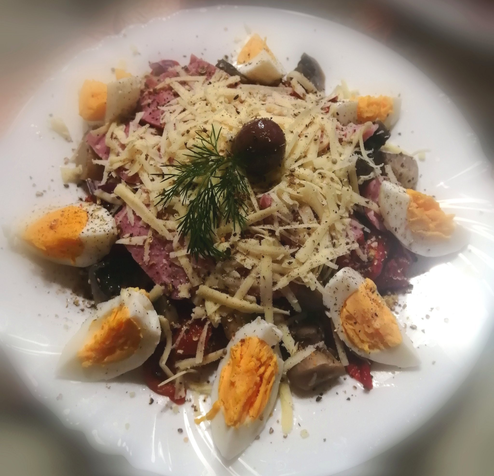 Съставки: Хубава прясна хрупкава краставица, чери домати, печен пипер, червен лук, сварени гъби, качествена шунка, варени яйца, кашкавал за поръска(символично), капки олио, малко сол, черен пипер и маслинка за украса.