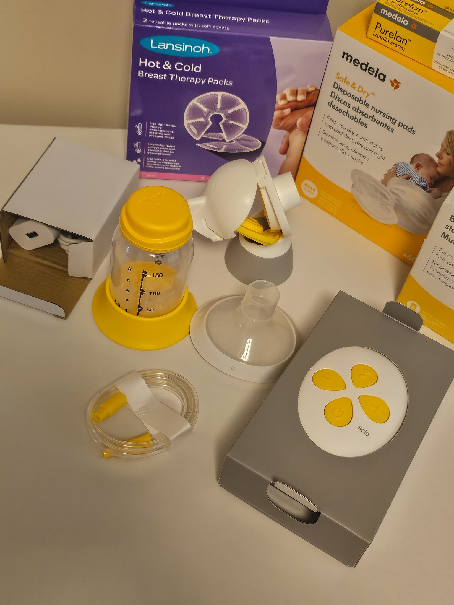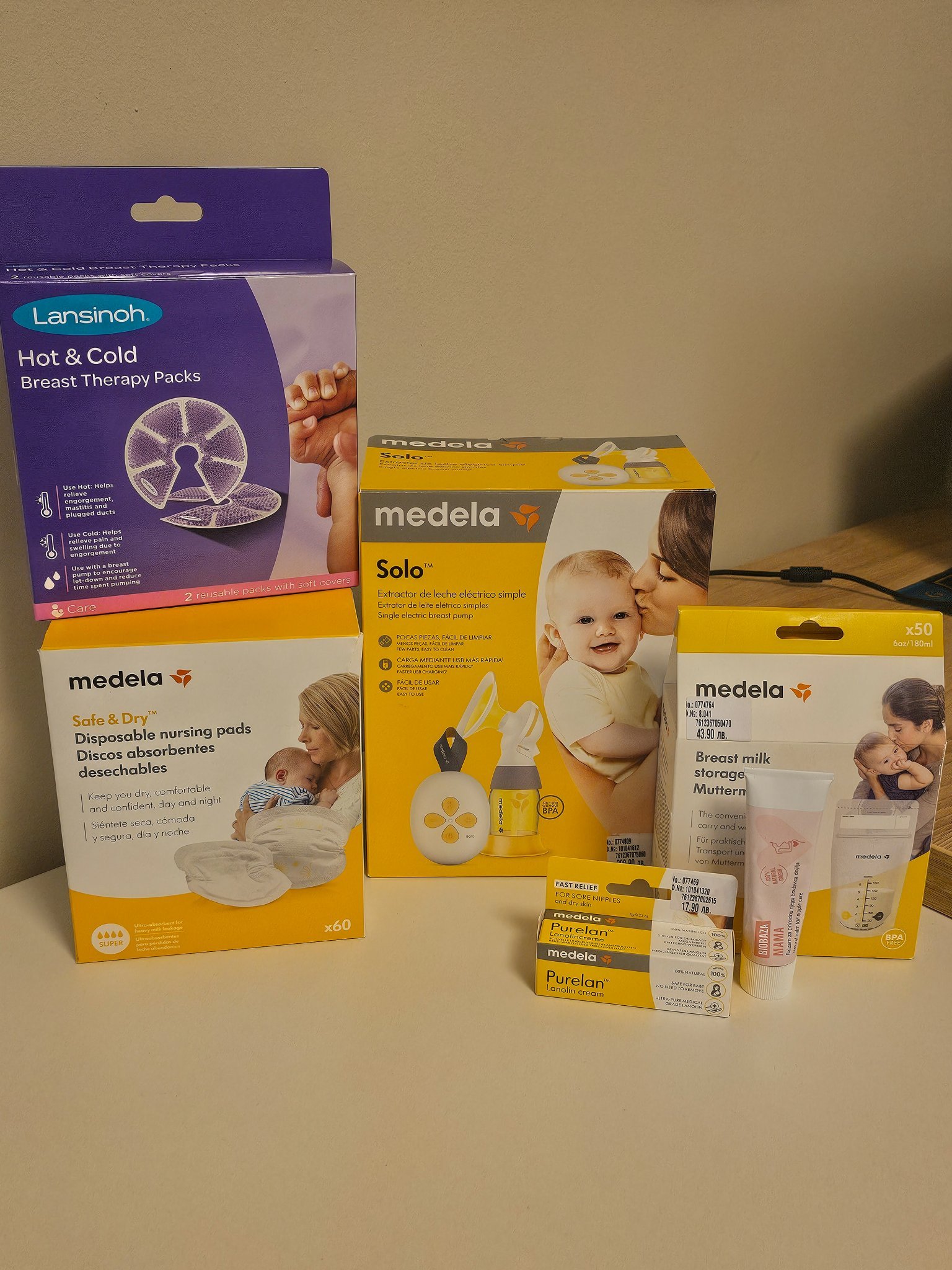 Помпата, компреси, пюрелан взех малък, защото мисля да ползвам този на Биобаза, тъй като и сега при разраняване мажа с него и ми действа добре, превръзки за гърди, ако текат + торбички за кърма (тези не са за директно изпомпване в тях, нямаха от тях като взимах).