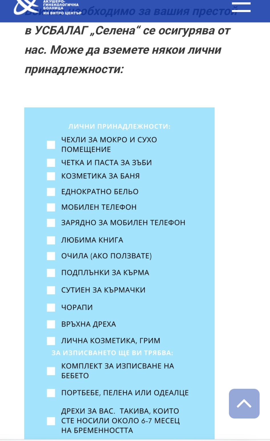 Осигуряват нощници, превръзки, има помпа за кърма на медела, храна, дрехи за бебето по време на престоя, АМ, кърпички и памперси за бебето, мисля че и хавлии имаше едно време, но аз съм си приготвила следния багаж, въпреки че ги има някой неща там. Последните години знам, че са доста натоварени и предпочитам да си имам необходимите неща отколкото да чакам да се освободи някой, за да ми донесе.