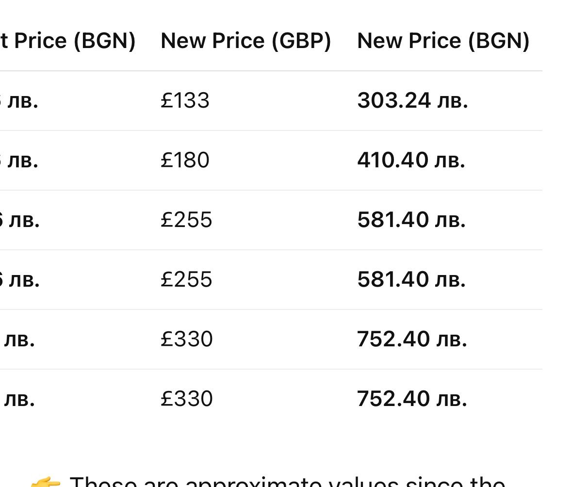 Тези цени не са актуални, аз ползвам от май месец и никога не е било под 130£. Тоест цените в тази таблица "новите" са сегашните, а ще се увеличат след седмица. Явно затова сега бавят поръчки, да поръчаме на новите цени. Доста тъпо