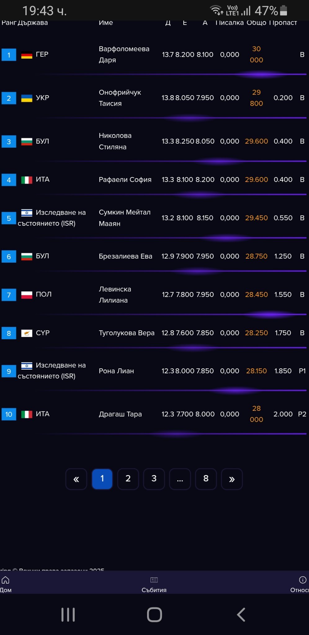 Дария Варфоломеев  игра само на обръч. Взимат се най добрите 3 резултата.