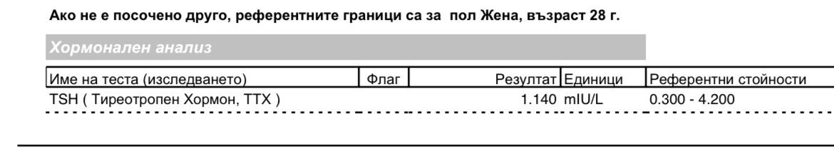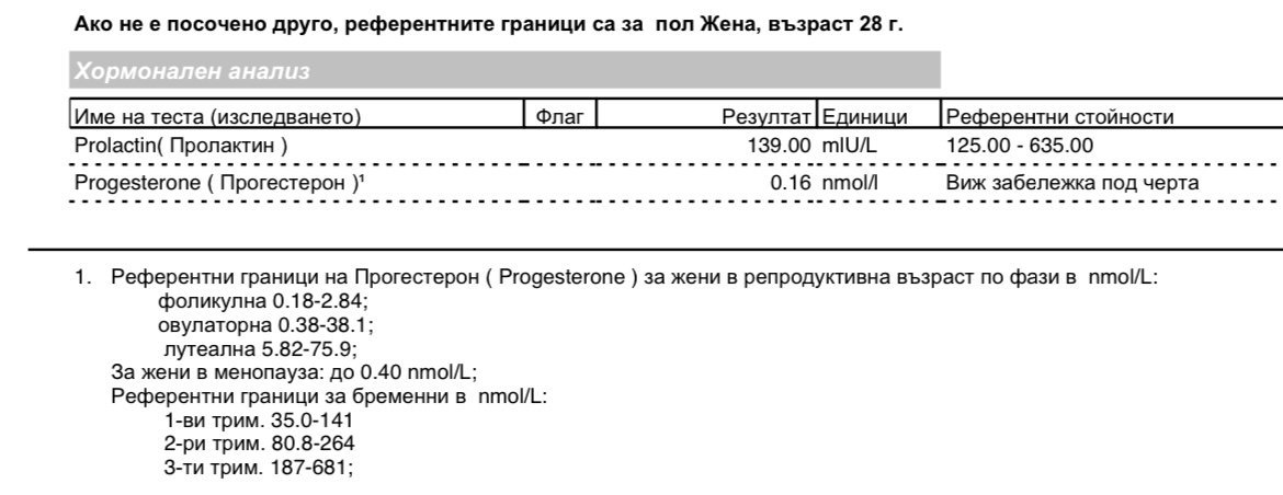 Да се отчитам и аз. Вчера бях на ендокринолог. TSH и пролактинът се нормализираха, но за да проверя овулацията, пуснах и прогестерона. Но тук резултатът беше плачевен. Разбрахме се да отида на гинеколог и да се направи стимулация. Напоследък не можах да намеря добър специалист за себе си, та ендокринологът ми предложи да ме запише при майка му, с която делят един кабинет. Чух добри отзиви за нея, по-принцип е известен АГ в Русе. И ако има нещо, поне ще работят съвместно върху ситуацията. Така че сега чакам 2 май.